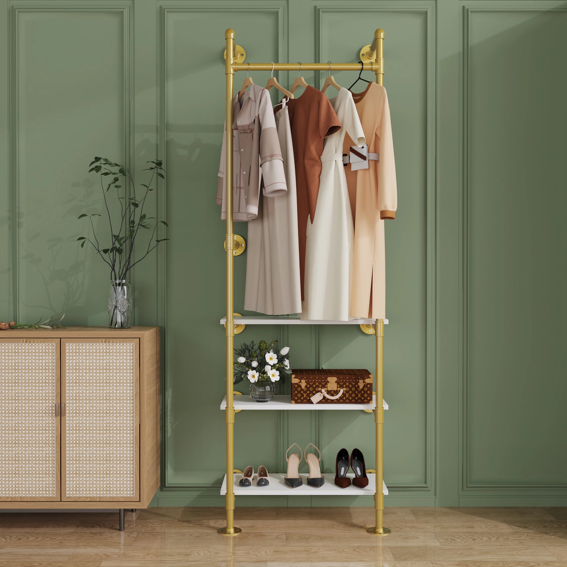 Unique Clothing Rack - Unique design clothing rack, it has a gold-tone pipe great for hanging a good amount of long clothes, heavy coats and accessories, bearing load of 25kg, white three tier open shelves for organizing folding clothes, baskets, sock boxes, shoes, max load of 30kg of each