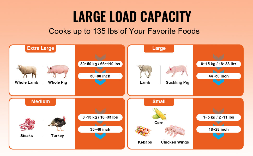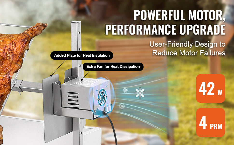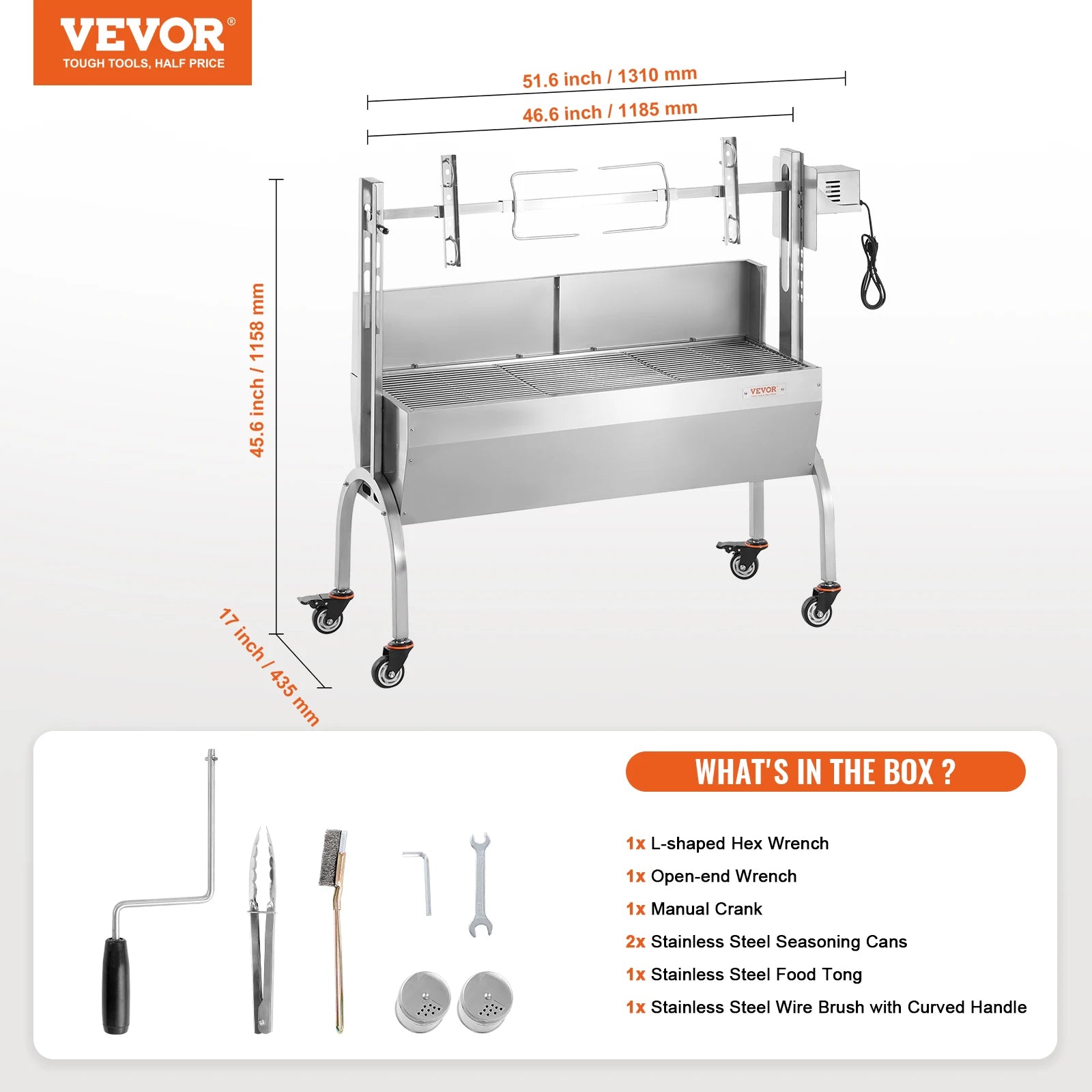 VEVOR 46inch Rotisserie Grill with Windscreen Charcoal Spit Grill 132 Lbs Capacity Stainless Steel Roaster with Lockable Wheels