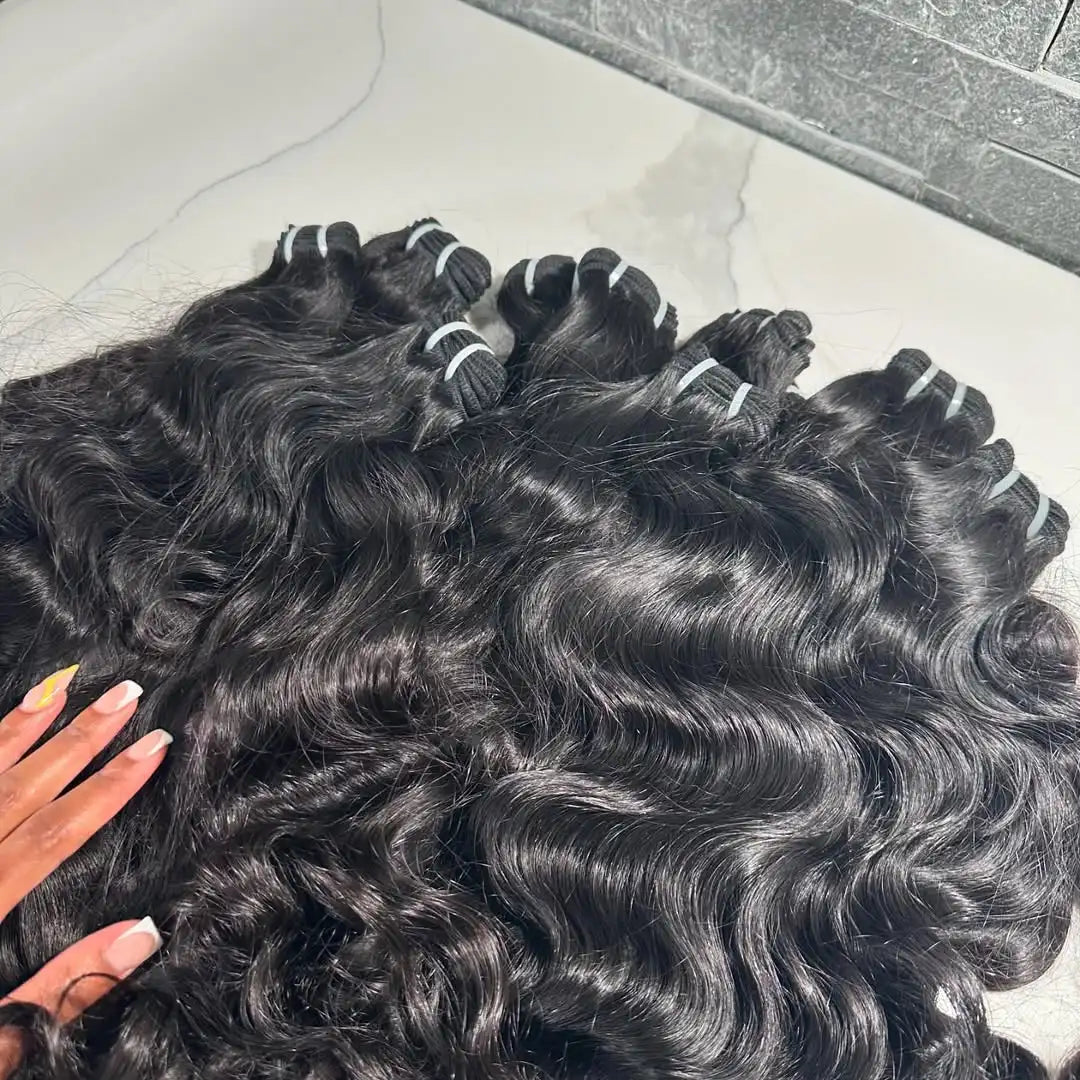 Hochwertige Remy-Haarverlängerungen aus unbehandeltem, kambodschanisch-burmesischem Echthaar mit intakter Schuppenschicht – natürlich gewelltes, unbehandeltes Echthaar