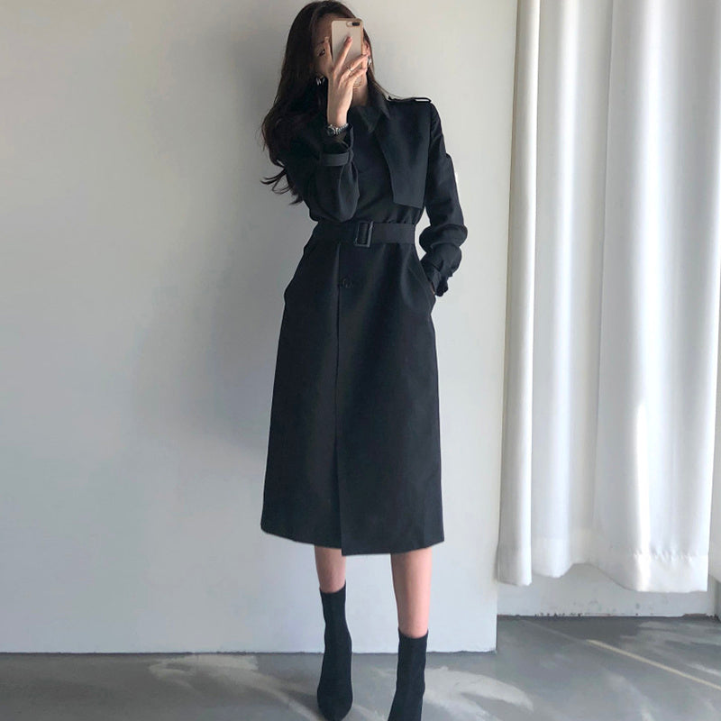 Reverskragen, doppelreihig, tailliert, gerader Schnitt, knielanger Trenchcoat