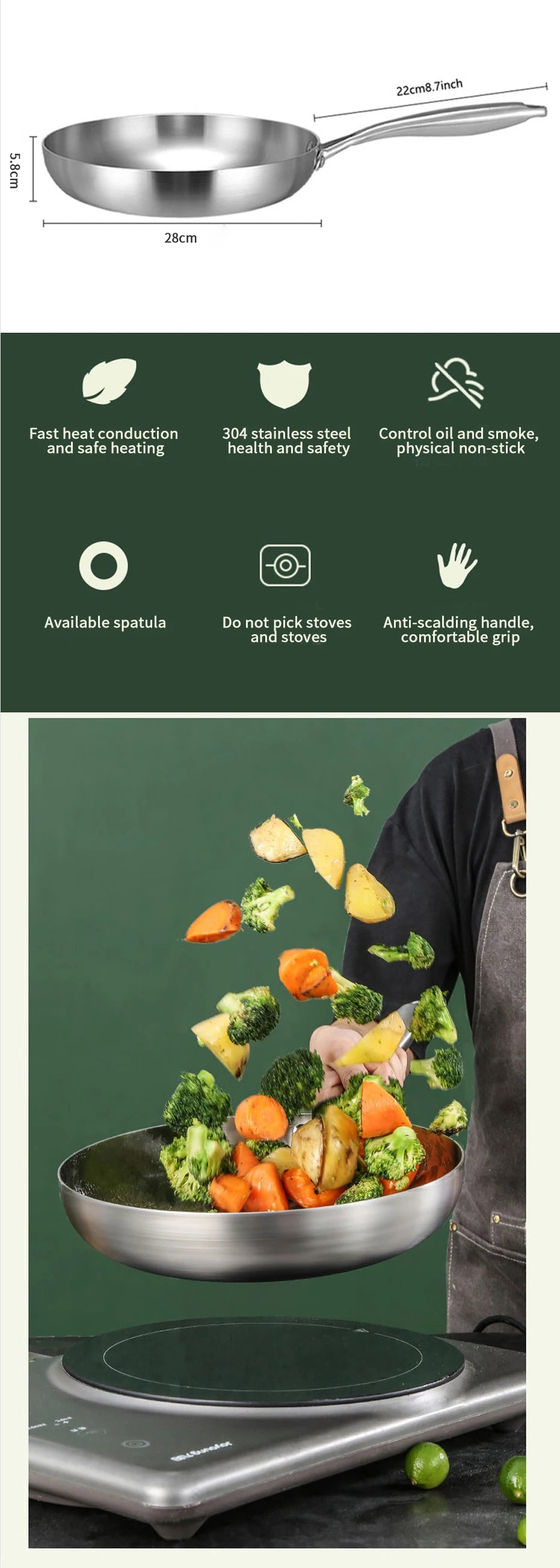 304 Stainless Steel Frying Pan, NonStick Pan Fried Steak Pot Uncoated Kitchen Cookware For Gas Stove and Induction Cooker