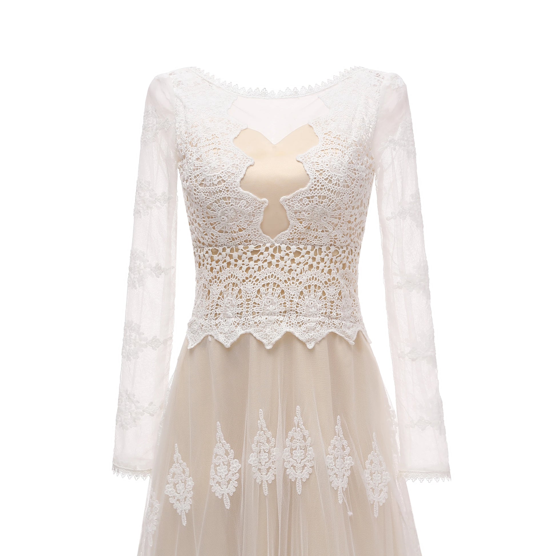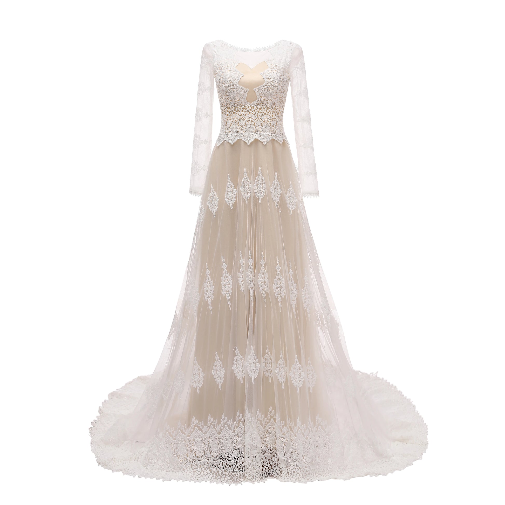 1301# REAL PHOTO Scoop Neck Backless Beach Lace Sweep Train Boho Full Sleeve Bride Gown Wedding Dress Bridal Gown
