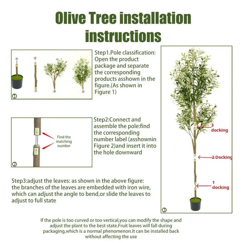 Easy to Assemble: The artificial olive tree is easy to install, just loosen the black straps on the trunk and insert the corresponding numbered branches into the trunk. And the main tree trunk come pre-assembled in heavy-duty pots made of plastic and concrete, so each tree can stand on its own.