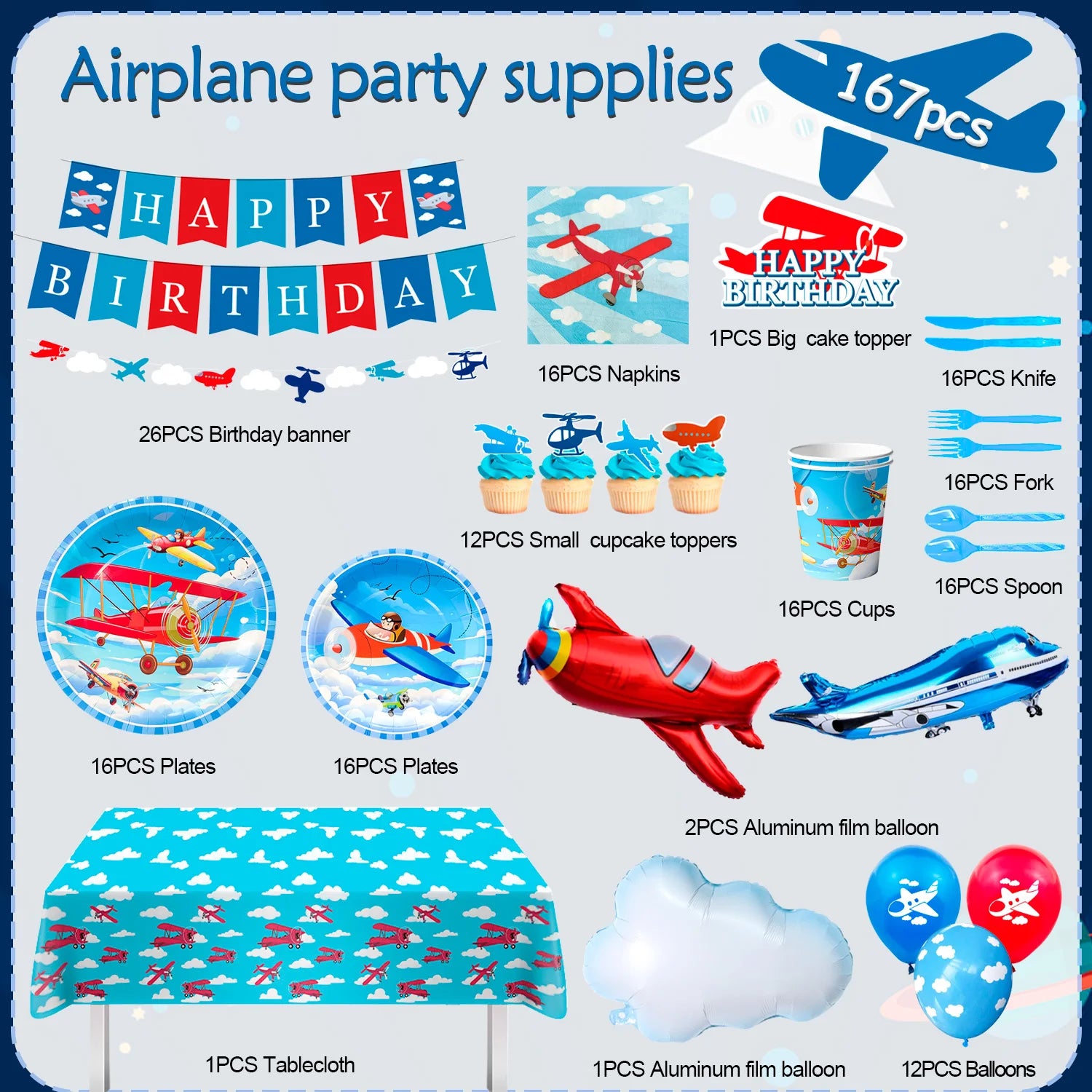 Airplane Birthday Party Decorations,167pcs decorations&Airplane Party Tableware set-Airplane Plates Napkins Cups TableCloth etc