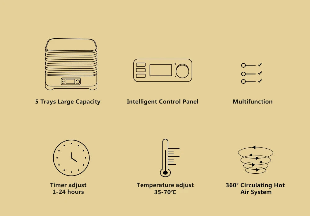 97% vitamin and mineral retention rate; This is definitely the best way to preserve food.TIMER & TEMPERATURE ADJUSTABLE - Features adjustable timer and temperature functions; Drying temperature can be set from 35℃-70℃, while the time can be set from 0-24 hours; Choose the optimal time and temperature depending on the ingredients; A hot air fan will automatically switch on and off to balance the temperature;