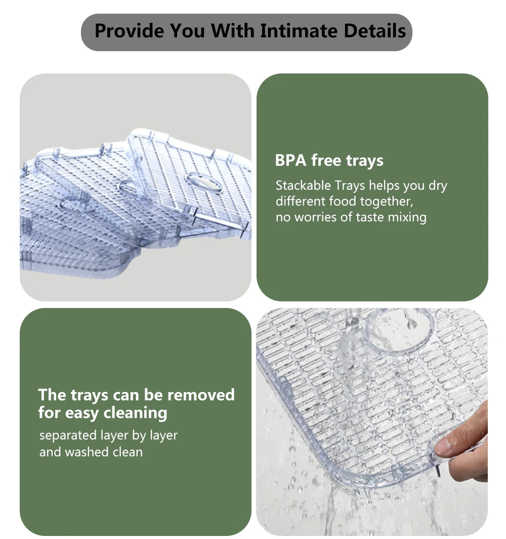 classify different food and increase productivity.PREMIUM MATERIAL - Made of a stainless-steel base and premium plastic trays, all the materials are free of BPA, and are absolutely safe for your health; The digital LED display screen allows you to accurately time and control temperature settings; Enjoy an easy, healthy homemade snack without any additives.