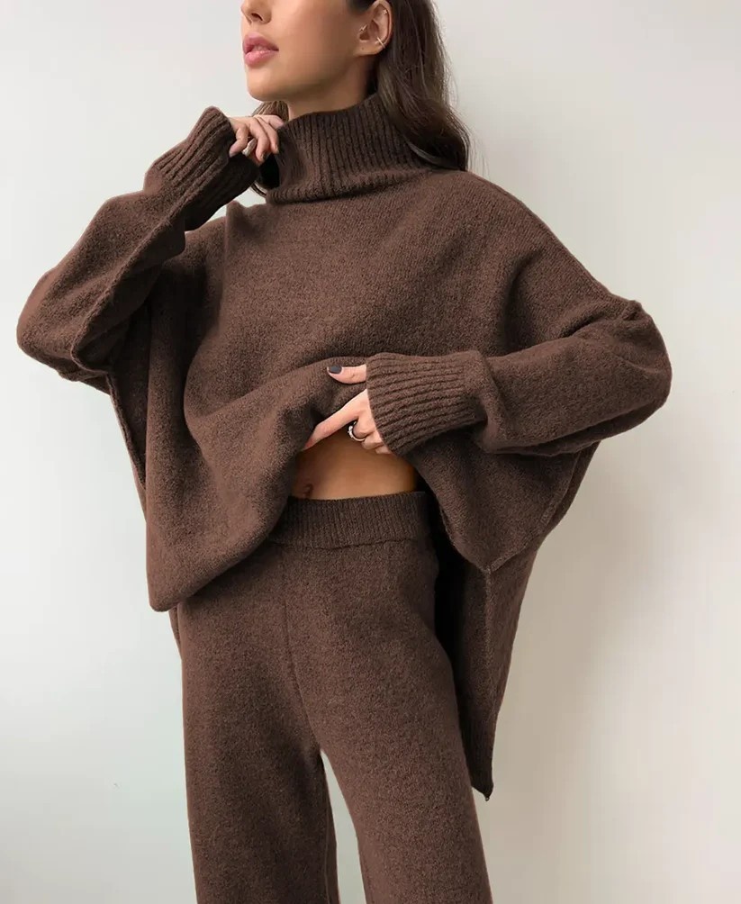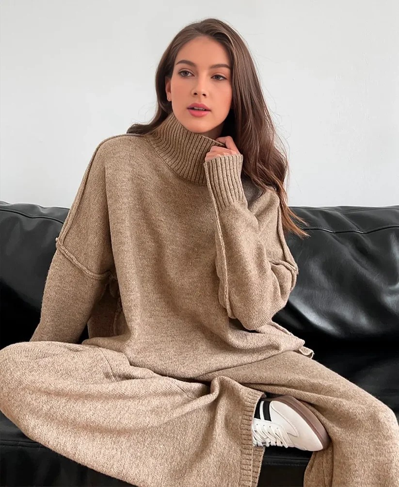 Casual Laid-back Style Solid Color Loose High Collar Knitted Sweater Suit