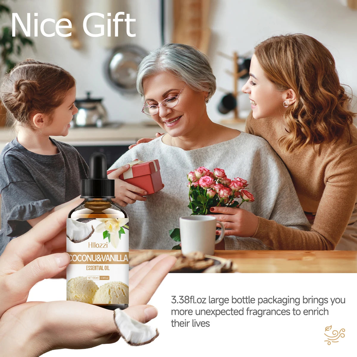 Coconut & Vanilla essential oil for body massage, aromatherapy diffuser, long lasting fragrance, suitable for all skin types.