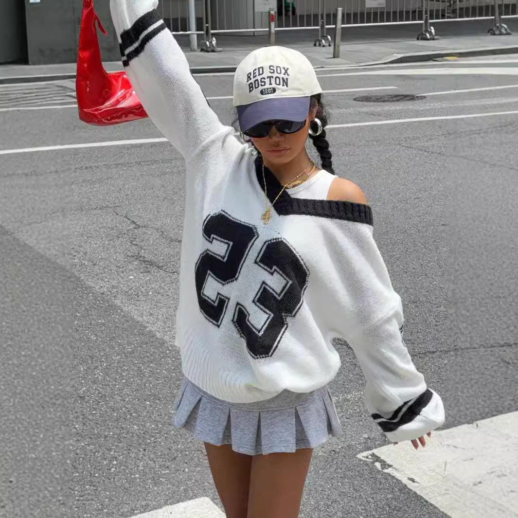 Contrast Color Digital Jacquard Loose-fitting V-neck Long Sleeves Sweater