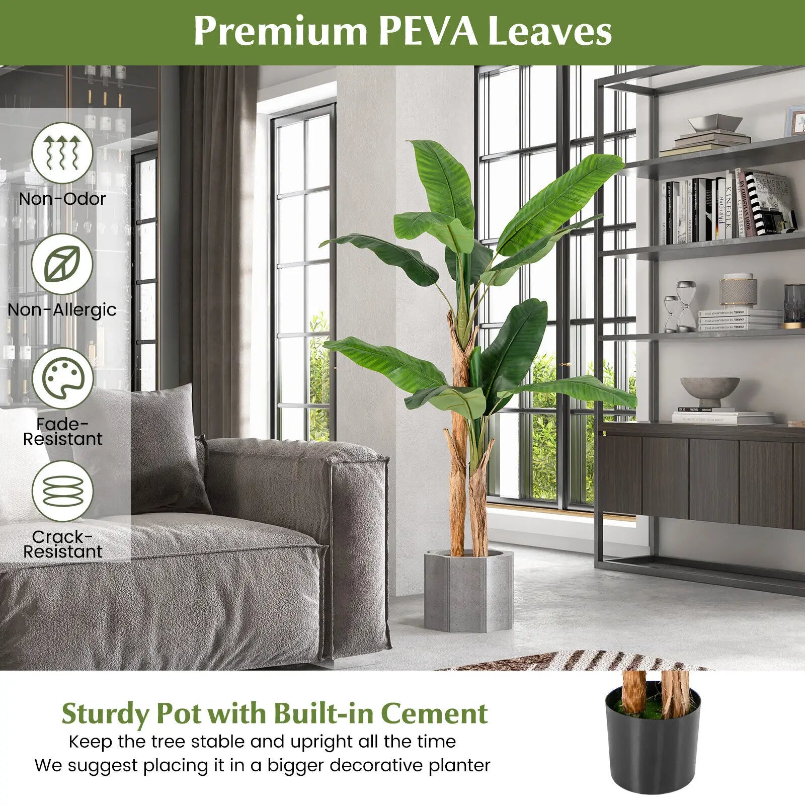 Transform your indoor space with the captivating allure of this lifelike artificial banana tree. Standing elegantly at 165 cm tall, it boasts an impressive display of 10 large leaves and double/triple lifelike stalks adorned with natural bark details, replicating the essence of a real banana tree. Crafted from premium PEVA leaves and PE stalks, this plant is durable, non-odor, and resistant to fading and cracking, ensuring a vibrant and fresh look for years to come. Supported by a sturdy pot with built-in cement and a thick trunk, this faux banana tree maintains stability and upright posture effortlessly. With no maintenance required, this evergreen beauty remains unaffected by seasons, making it a versatile and hassle-free choice for enhancing any space.Lifelike design with large leaves and natural bark detail
