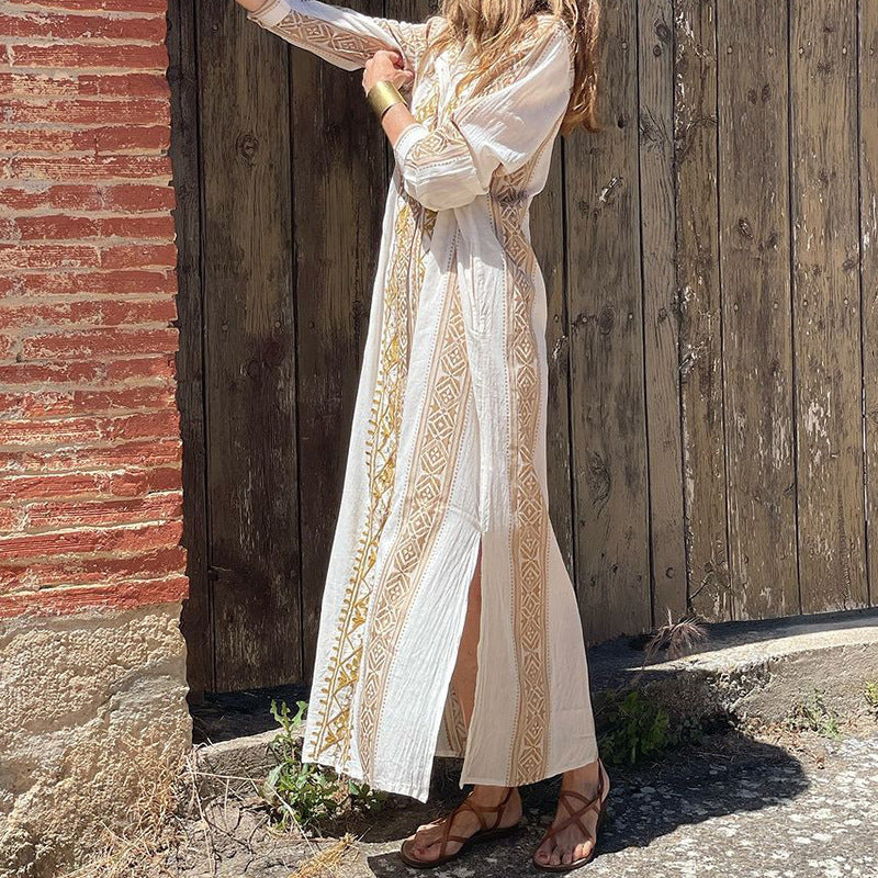 European American Fashion Floral Print Long Sleeve National Style Bohemian Mid-length Dress