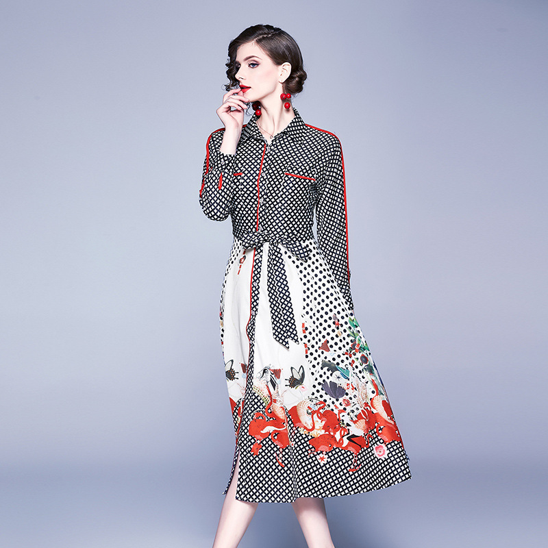 Fashion Printed Long-sleeved Waist Waist Mid-length Western-style Dress