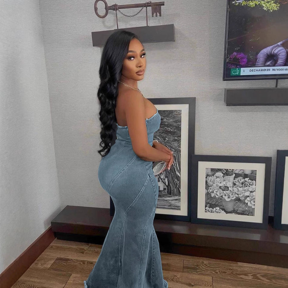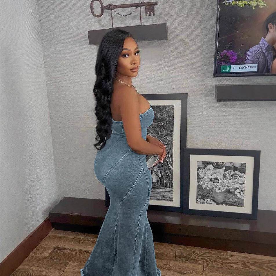 Fashion Slim-fit Chest Wrap Dress Fishtail Hip Wrap Denim Dress