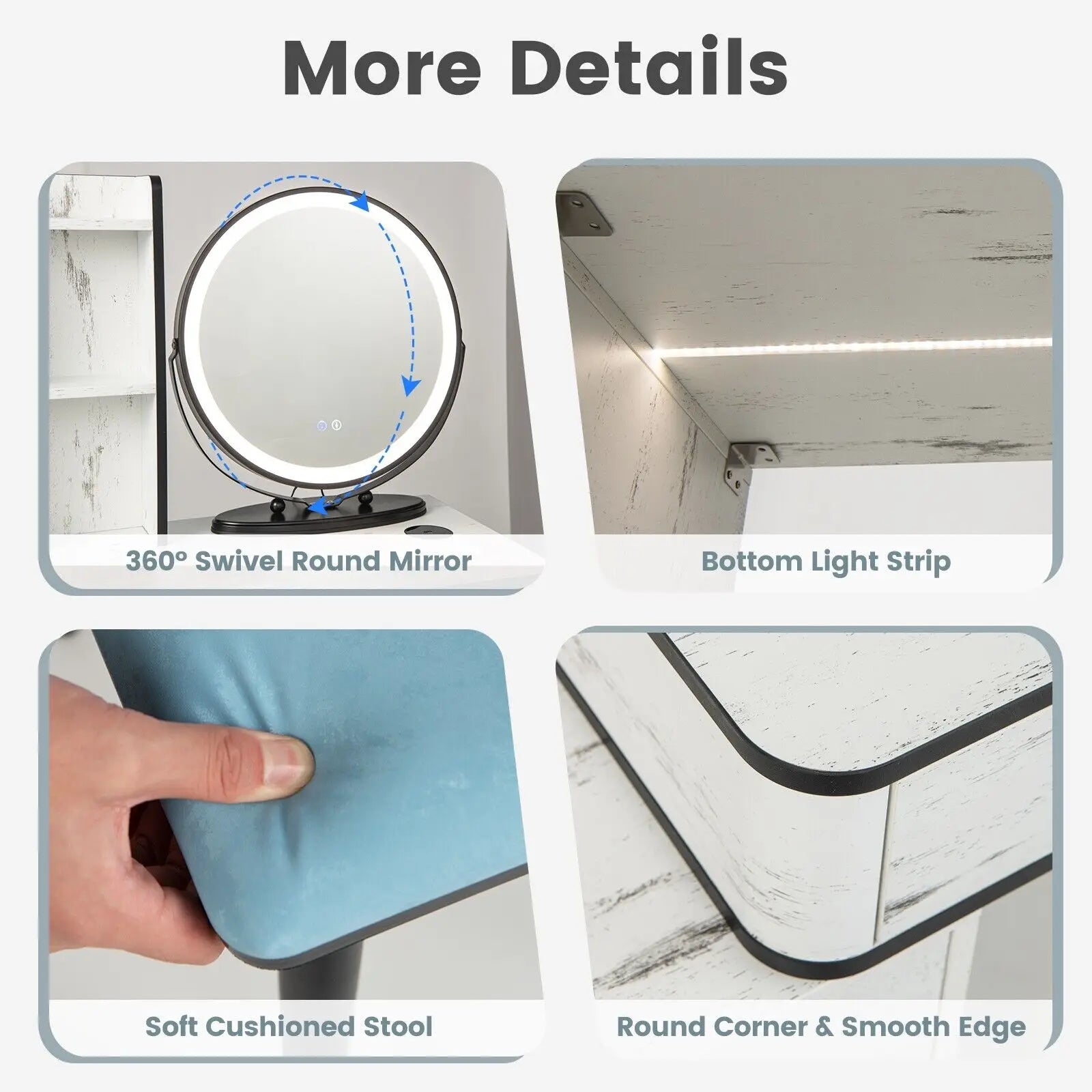 The dresser is made of premium MDF and sturdy steel, which is solid and durable for long-term use. The LED lighted mirror with 3 colors and stepless brightness can be easily adjusted by means of the touch sensor switch according to your different needs. The memory function and human body induction offers you an unmatched using experience. Besides, the sufficient storage space created by 3 open shelves, acrylic cosmetic tray, spacious tabletop, 2 drawers and 3-drawer cabinet let you manage a variety of daily essentials and beauty accessories in a neat and classified manner. Even better, the 3-in-1 charging station makes it possible to charge 3 electronic devices simultaneously. By removing the round mirror, you can use the vanity table as a laptop desk.