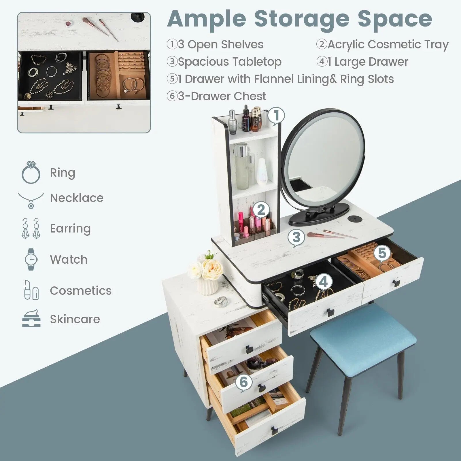 GOFLAME Vanity Set with 3-Color Lighted Mirror, Makeup Table w/ Cushioned Stool, 3-Drawer Chest