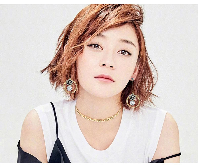Korea Fashion Black Enamel Camellia Earrings Women Luxury brand Long Big Cubic Zirconia Drop Earrings Wedding Jewelry Z277