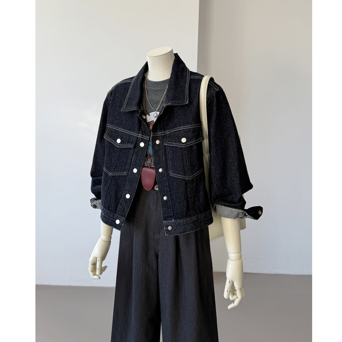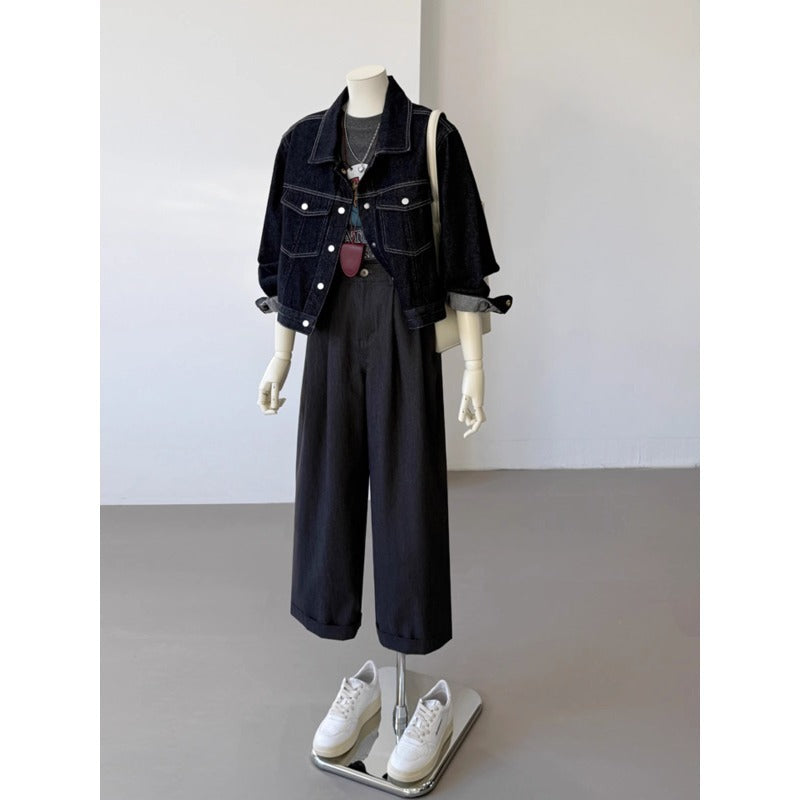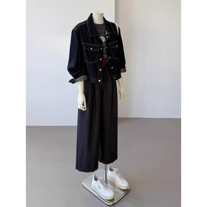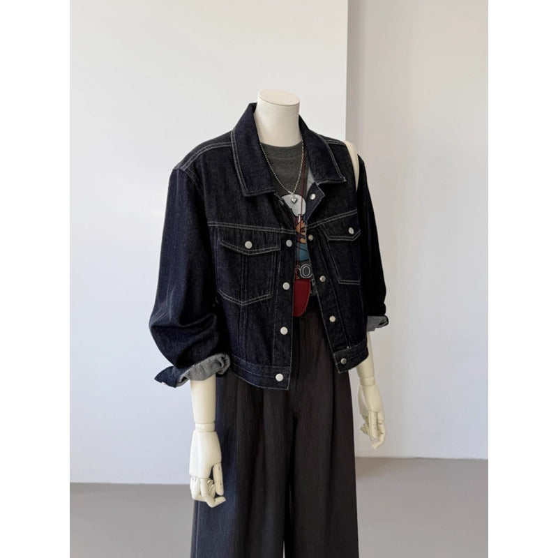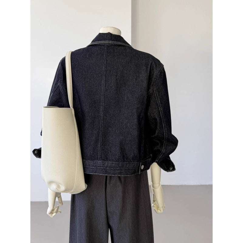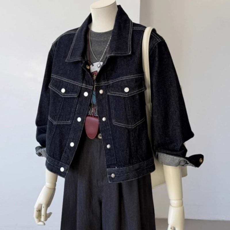 Korean Style Pocket Lapels Retro Dark Blue Short Denim Coat