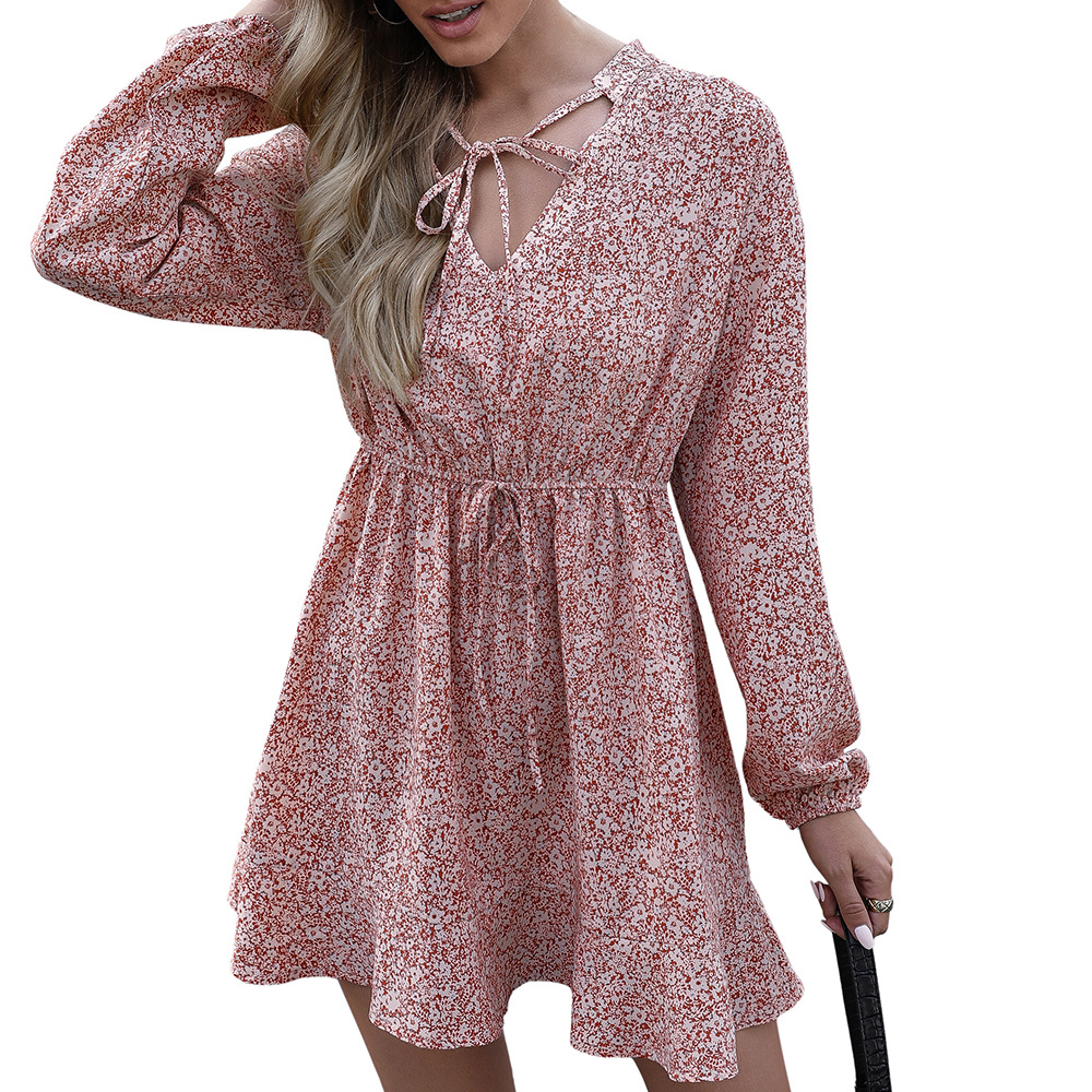 Lace V-Neck Floral Long Sleeve Mid-Length Dress Women