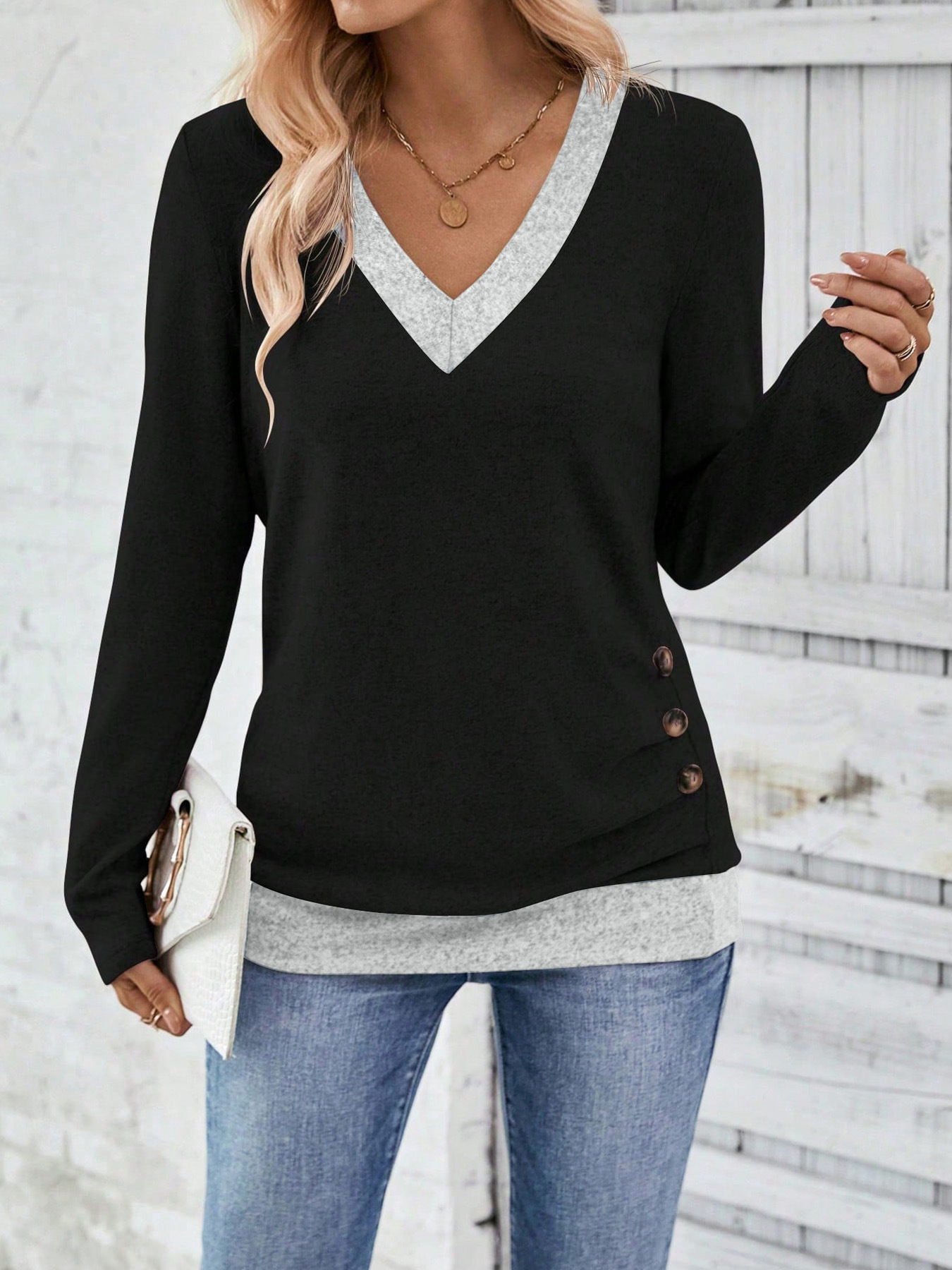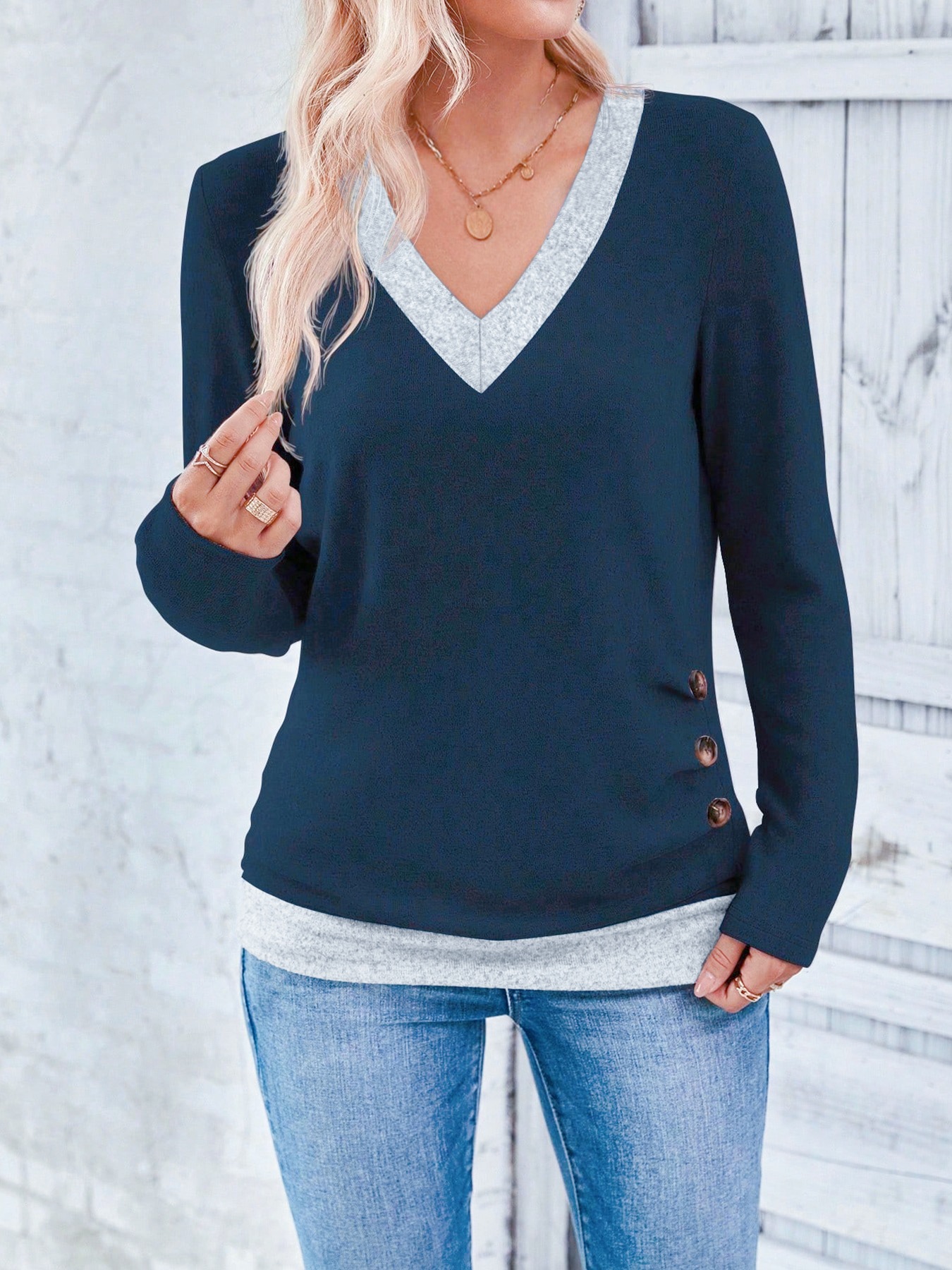 Long Sleeve V-neck Elegant Pleated Button Solid Color T-shirt Top