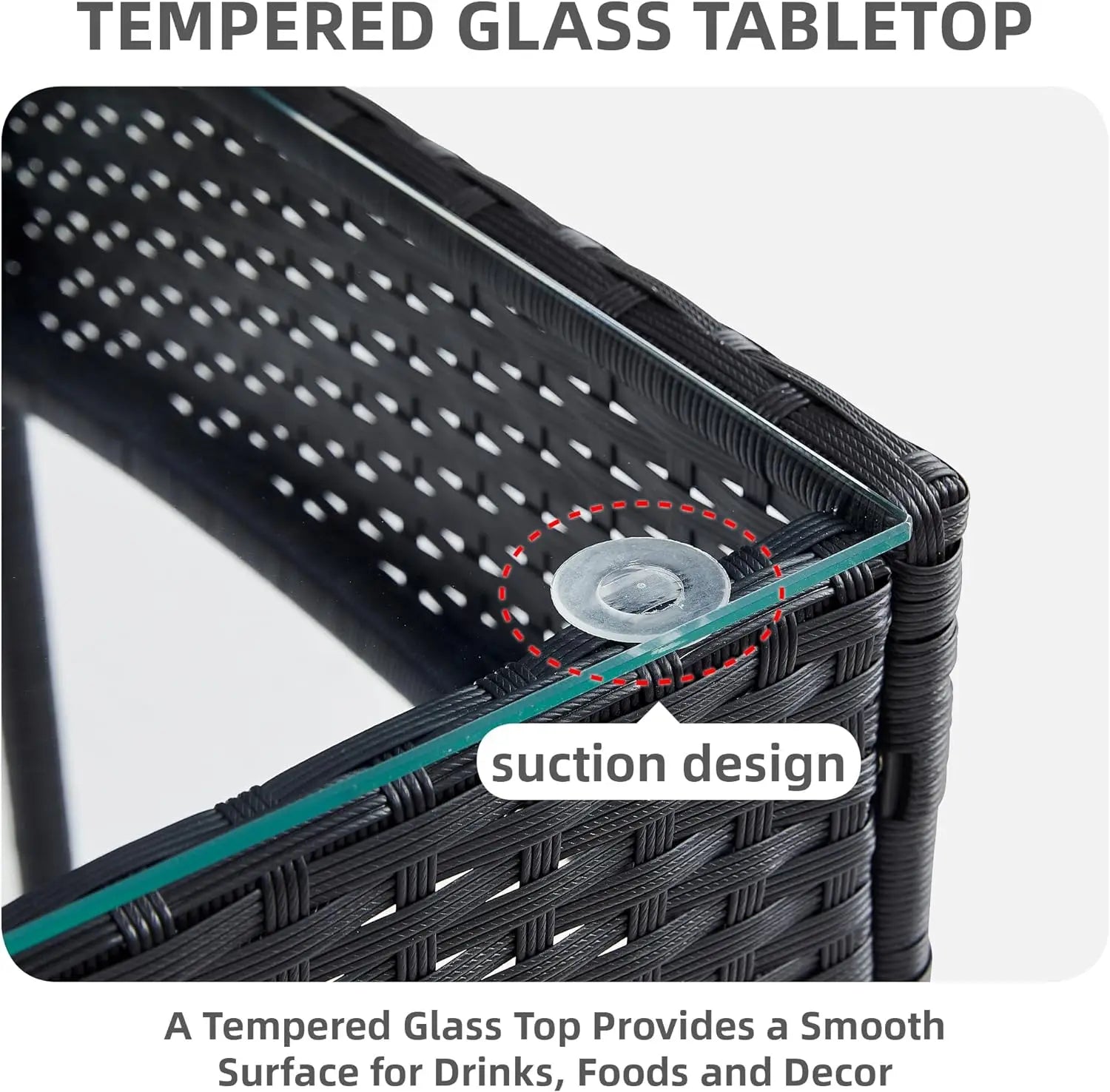 TEMPERED GLASS TABLETOP A Tempered Glass Top Provides a Smooth Surface for Drinks, Foods and Decor