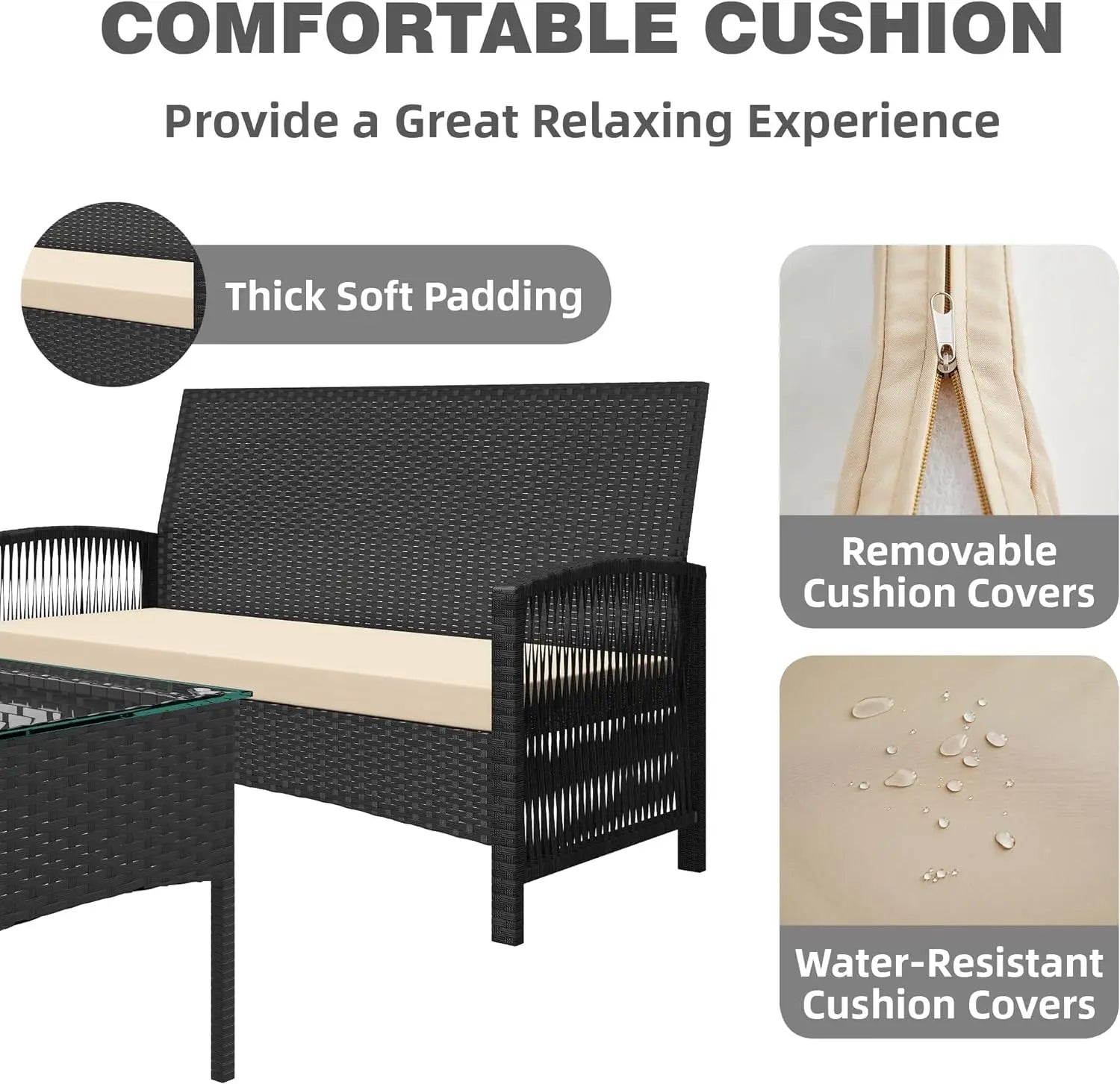 mcc direct 4-piece rattan furniture set, perfect for creating a cozy outdoor seating area for you and your family. This set includes two chairs, one sofa, and a coffee table with a tempered glass top, providing ample space for relaxing and entertaining. Designed with comfort in mind, the thick padded water resistant cushions offer a luxurious seating experience and the covers are easily removable for cleaning convenience. The curved arm design adds a touch of elegance to the set, enhancing its visual appeal. Crafted with a sturdy metal frame and PE rattan, this furniture set is built to last and requires minimal maintenance making it the perfect choice for outdoor use so you can make memories with your family and friends for years to come.