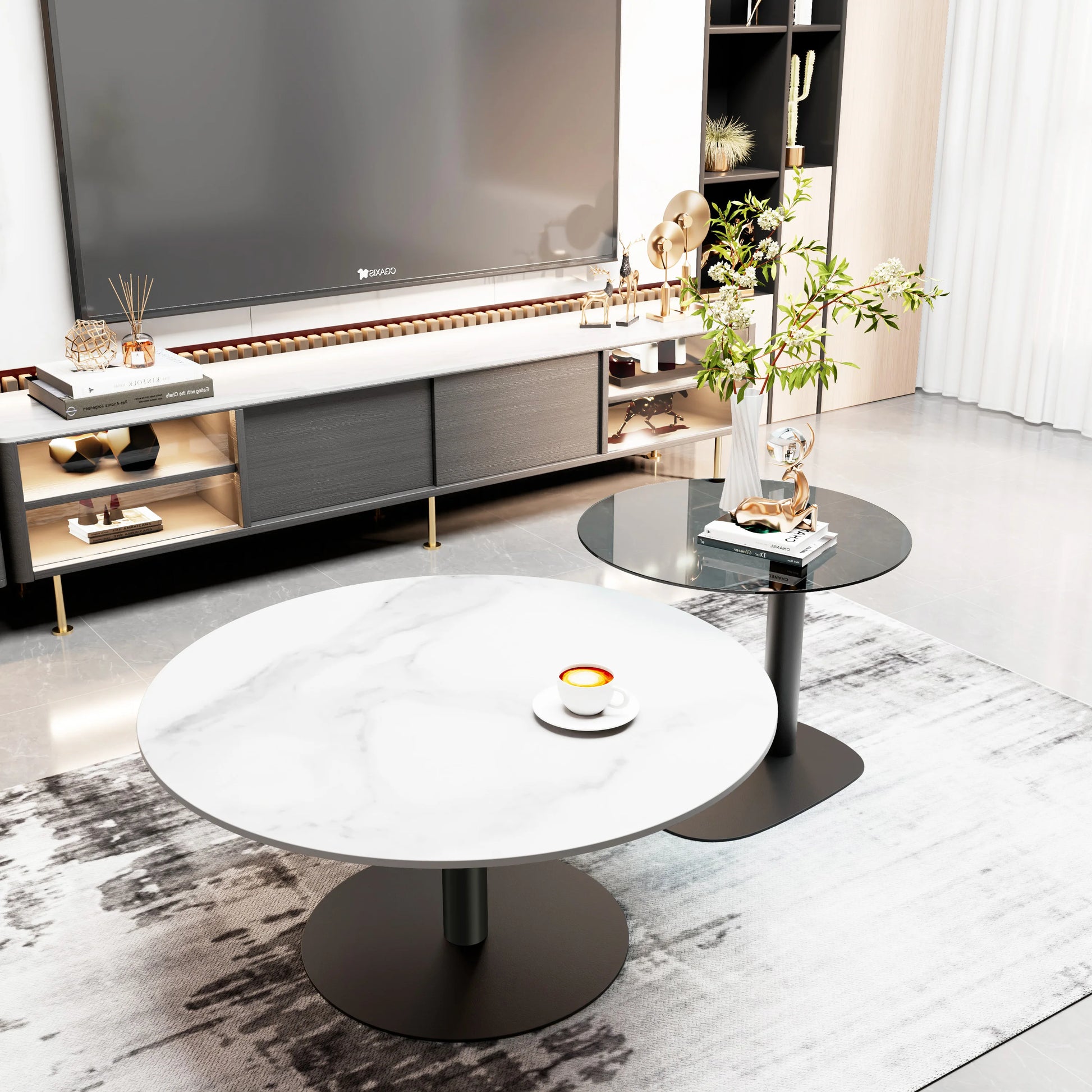 Modern Coffee Table Set, Round Nesting Table, Beech Wood, Sintered Stone and Glass, Set of 2 for Living Room Offoce
