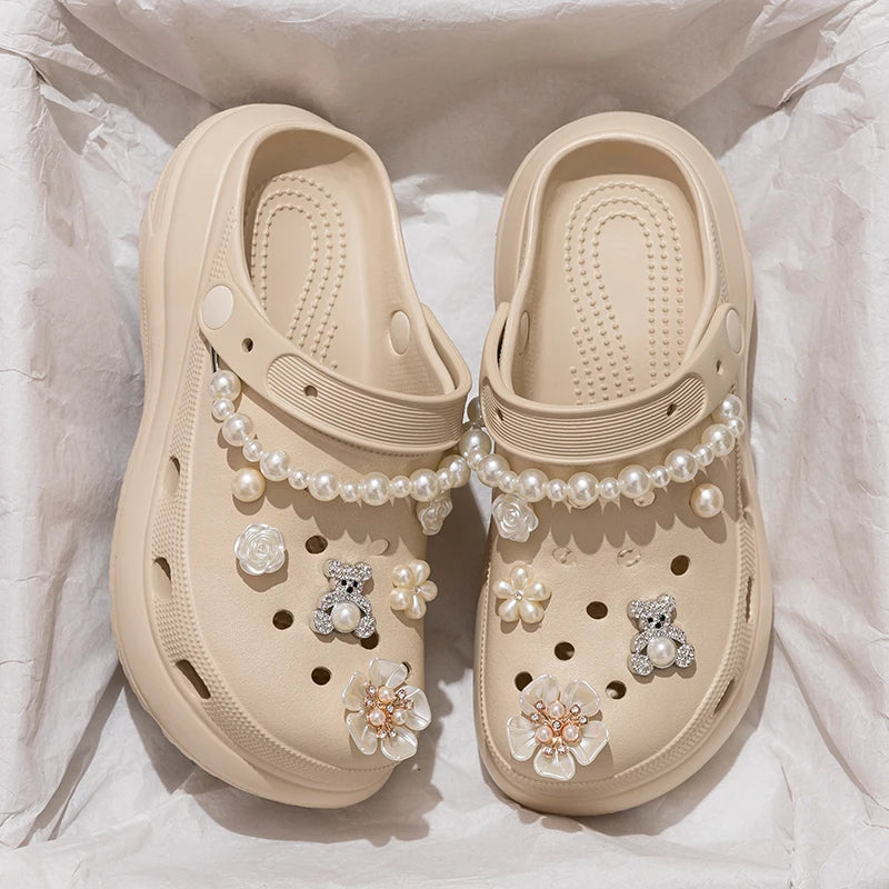 Pearl Chain Chunky Platform Sandals Women 2025 Summer Thick Bottom Beach Clogs Shoes Woman Fashion Flower Decor EVA Garden Shoes