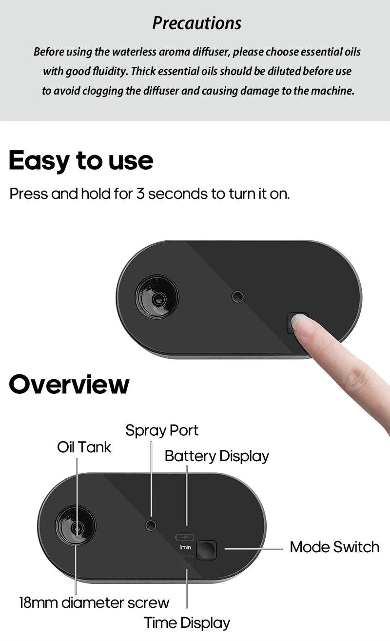 Portable Waterless Aroma Diffuser Automatic Induction Essential Oil Atomising Diffuser with Timed Mist for Bedroom Holiday Gift