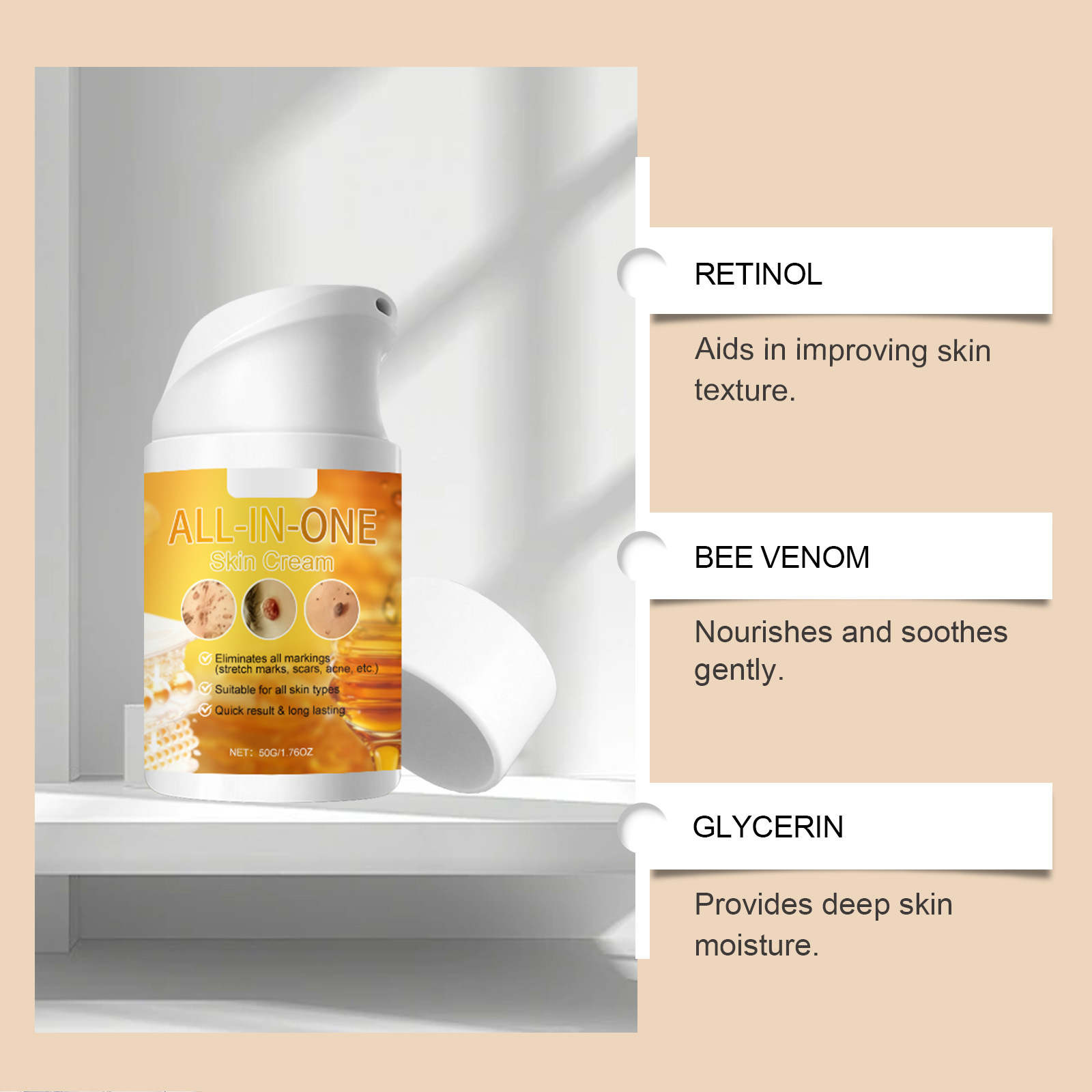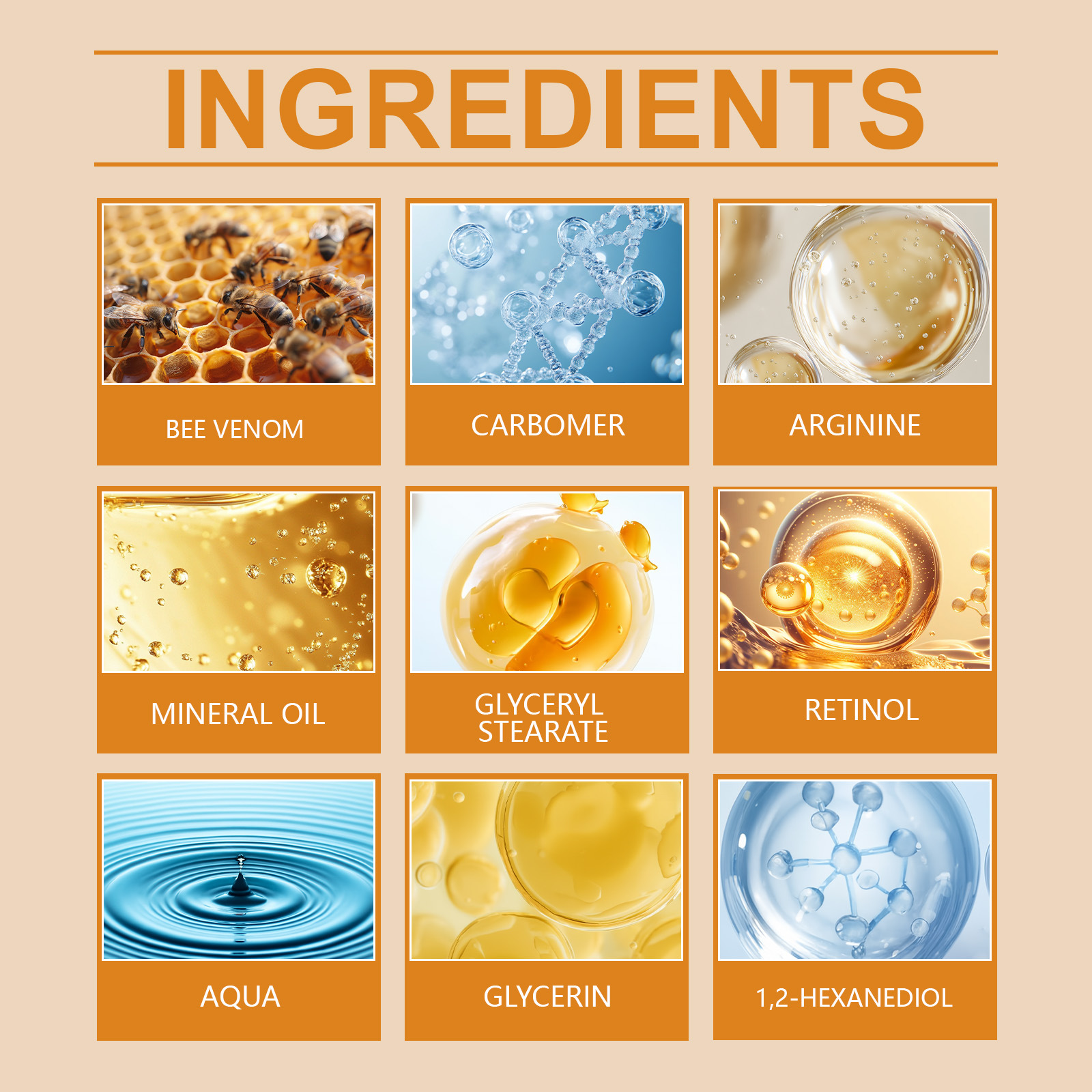 Ingredients: water, mineral oil, glycerin, glycerol stearate, 1,2- hexanediol, carbomer, arginine, bee venom, retinol.