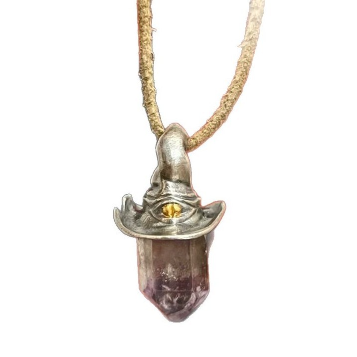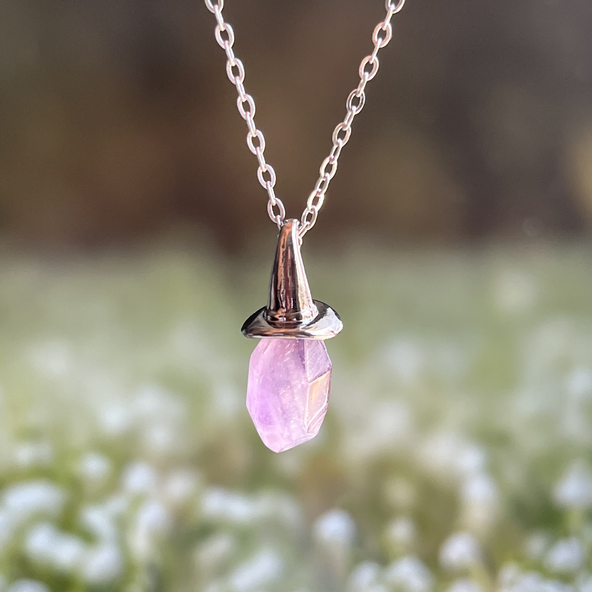 Retro Natural Amethyst Hexagonal Witch Hat Pendant Necklace