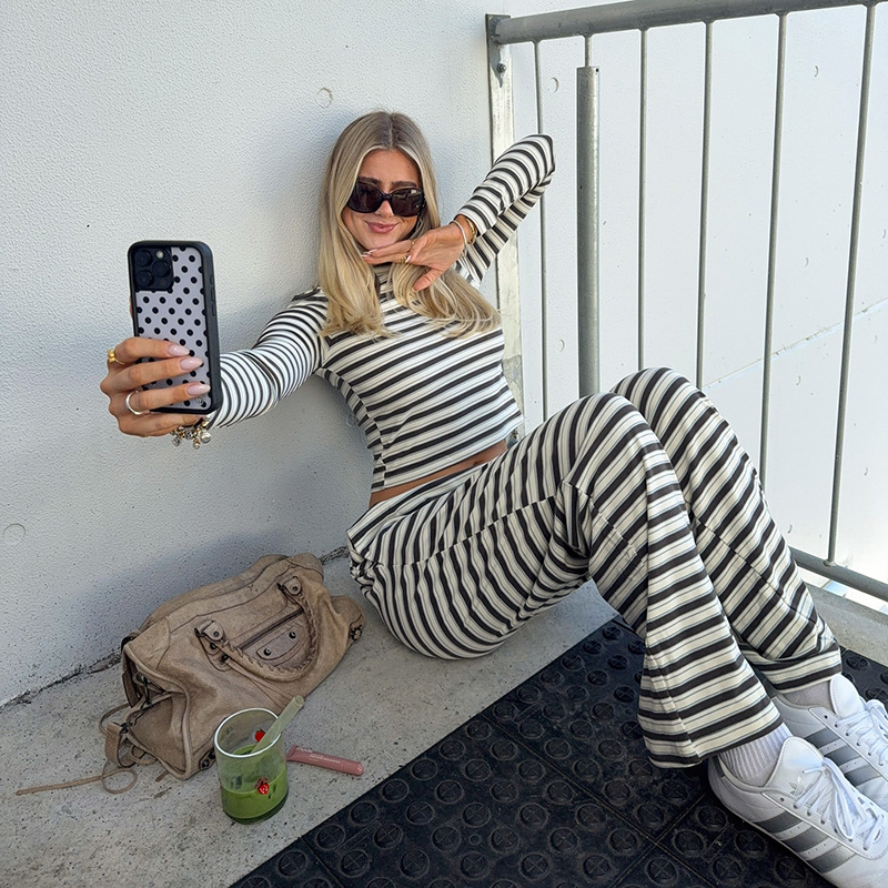 Round Neck Striped Long Sleeve Straight-leg Trousers Suit Women