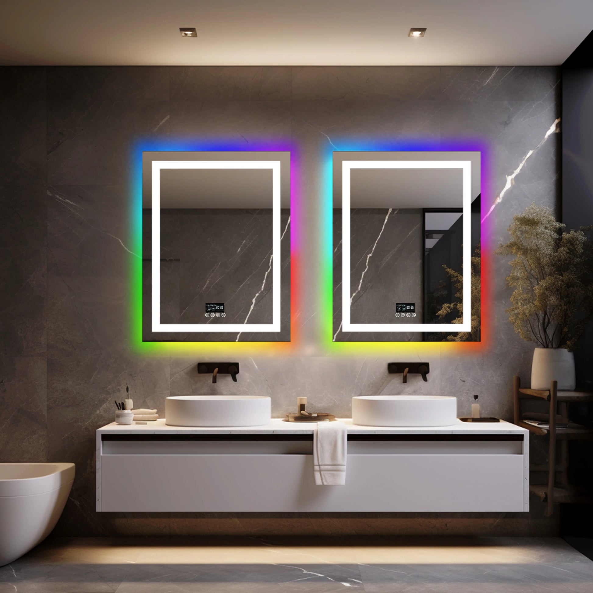 Round/Sqaure RGB LED Bathroom Mirror with Bluetooth Speaker Front-lit and Backlight Wall Dimmable Antifog Vanity Mirror