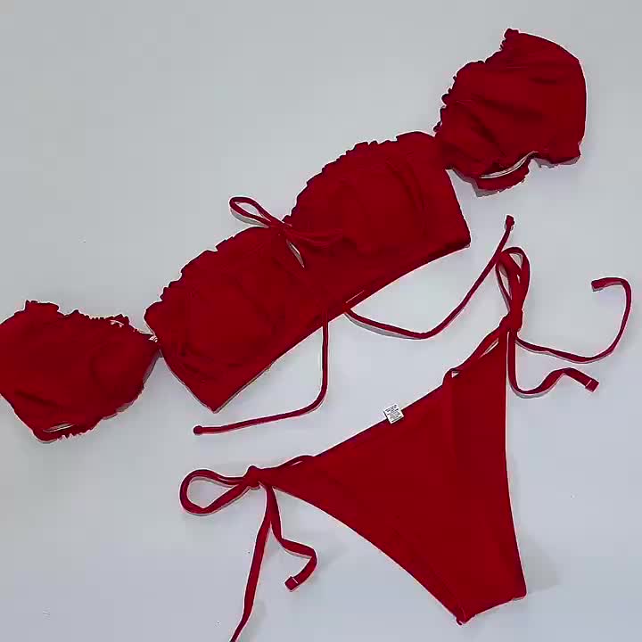 Ruffle Lettuce Trim Ruched Bikini Sets, Tie Side Drawstring High Cut Two Piece Swimsuit, Women's Swimwear & Clothing