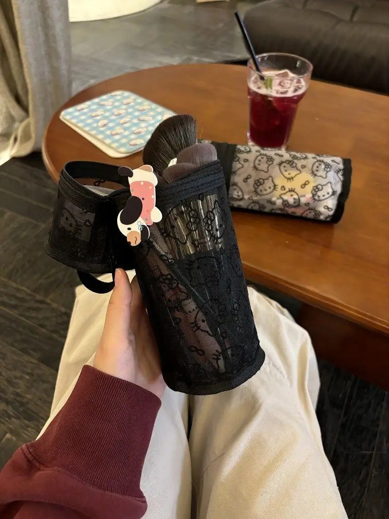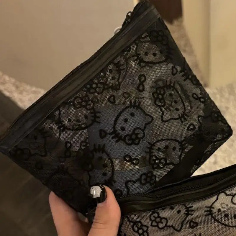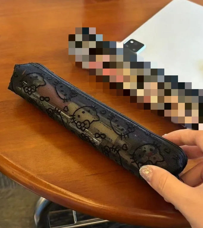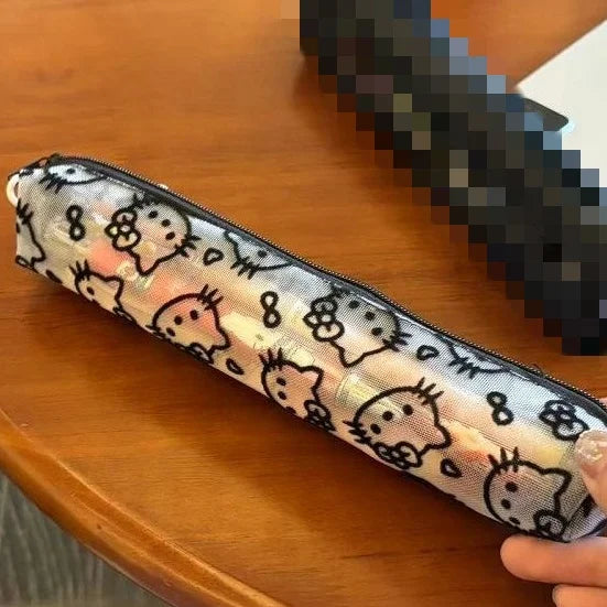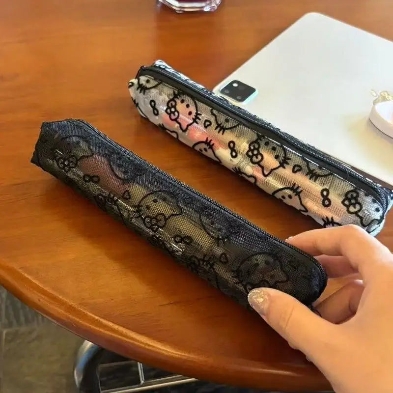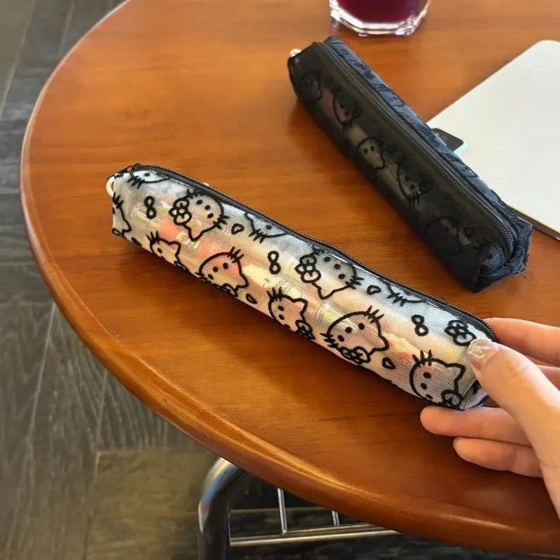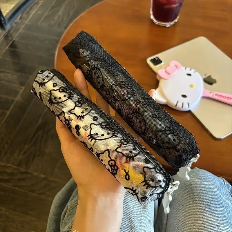Sanrio Mesh Hello Kitty Black and White Pencil Case Zero Wallet Headphone Bag Girl's Portable Makeup Brush Storage Bag Gift