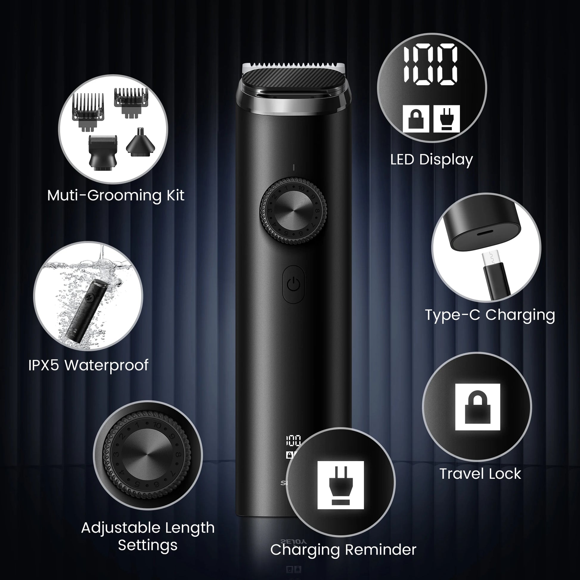 Function: Electric length adjustment,wet haircut,dry haircut,floating head,Automatic power selection based on bristle density,Washing knives under water,Fast Charging,Charging indication