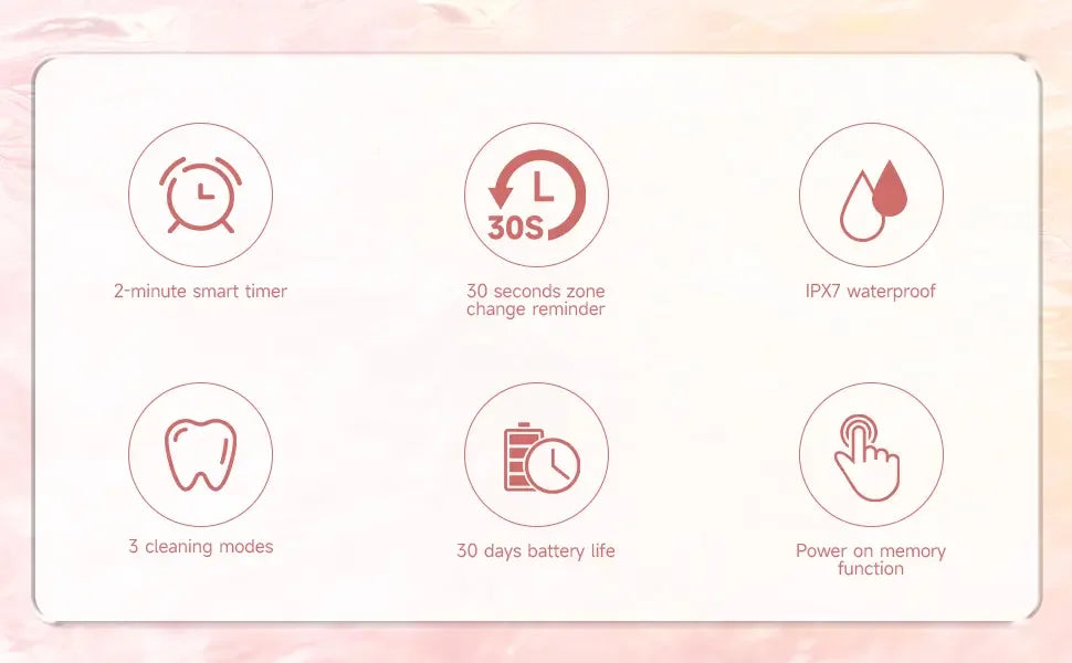 Function: Deep cleaning mode,Plaque removal mode,Whitening mode,Mode "gentle cleaning",Massage mode,timer