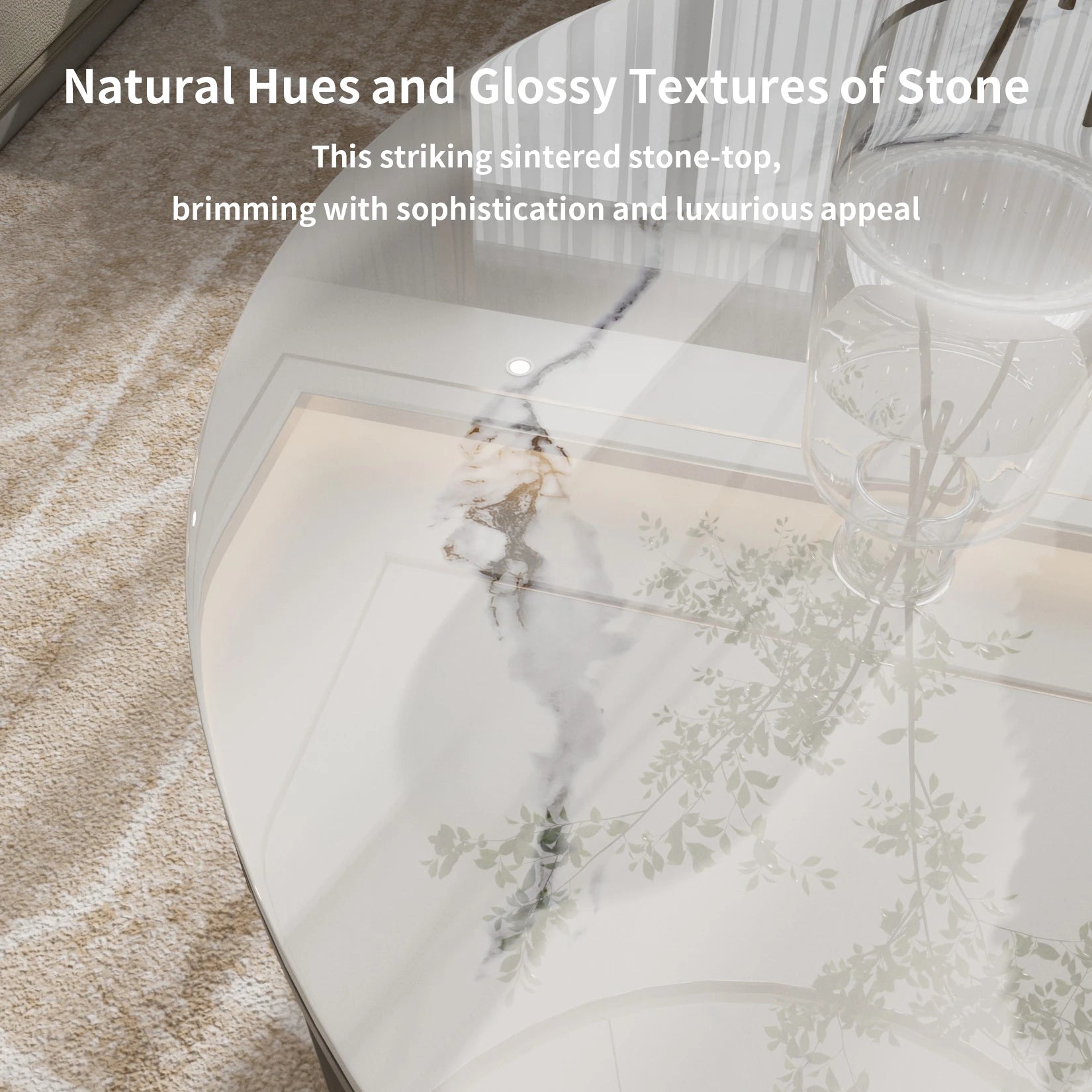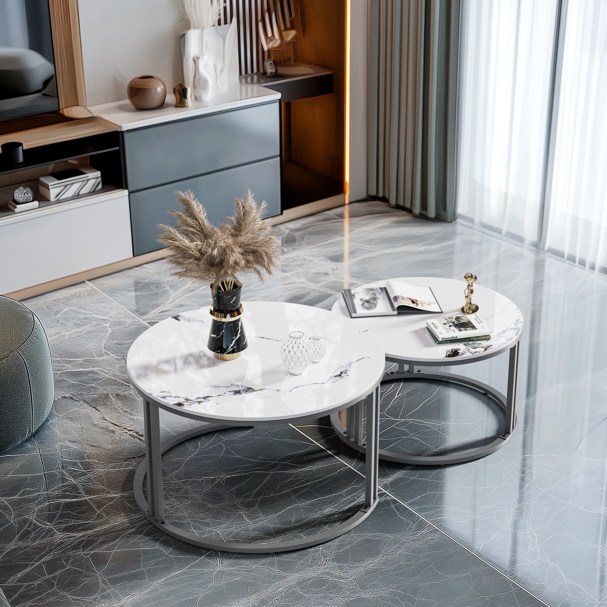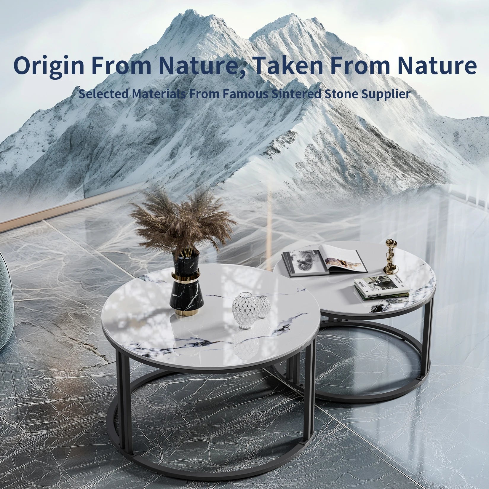 Set of 2 Modern Round Nesting Coffee Table Sintered Stone-top Stacking Sofa Accent Table for Living Rooms Aluminum Frame