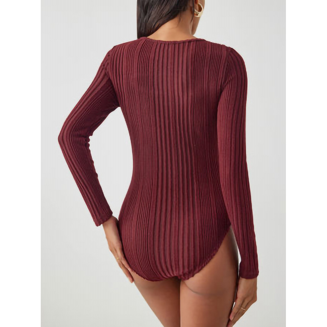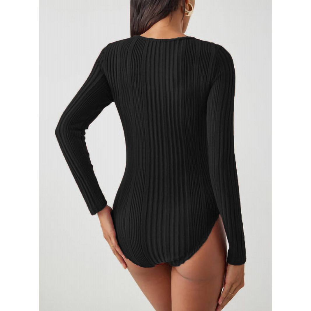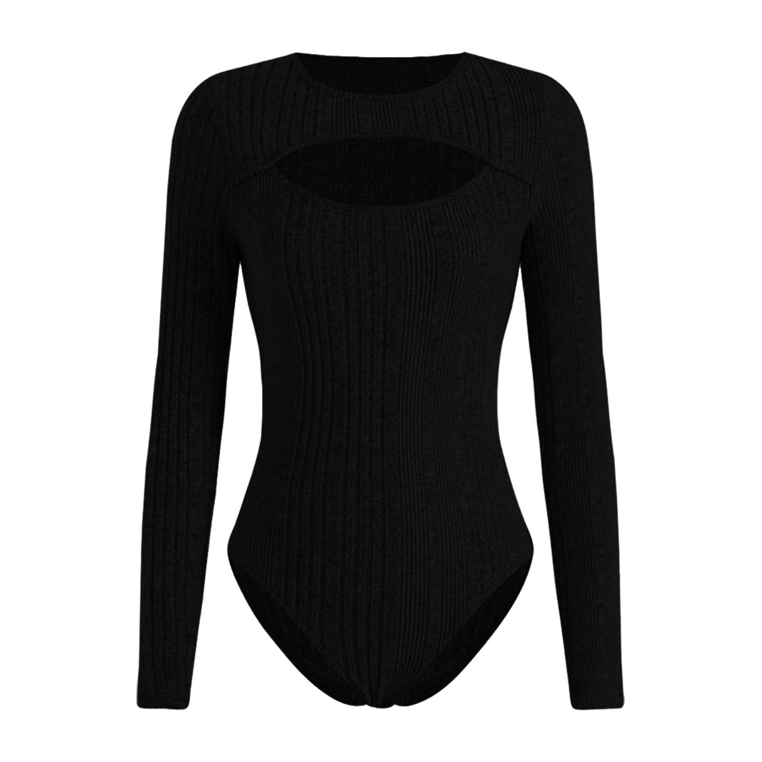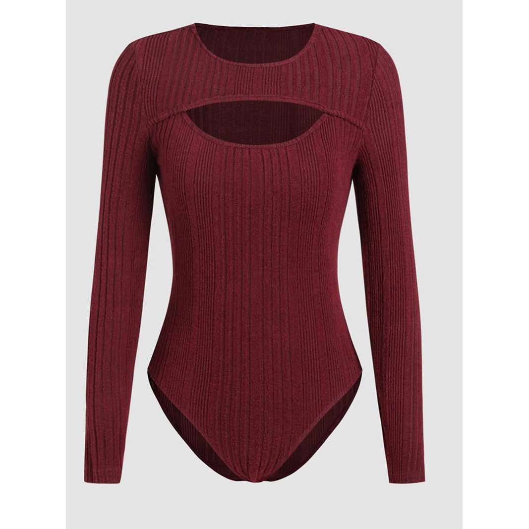 Sunken Stripe Hollow-out Slim-fit One-piece T-shirt Round Neck Long Sleeve Top