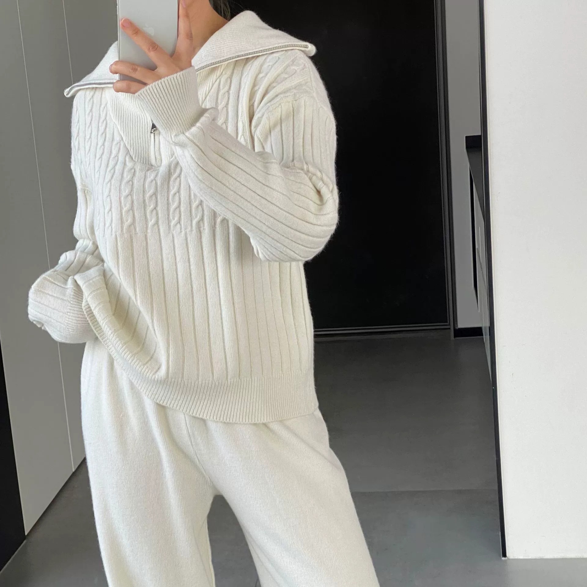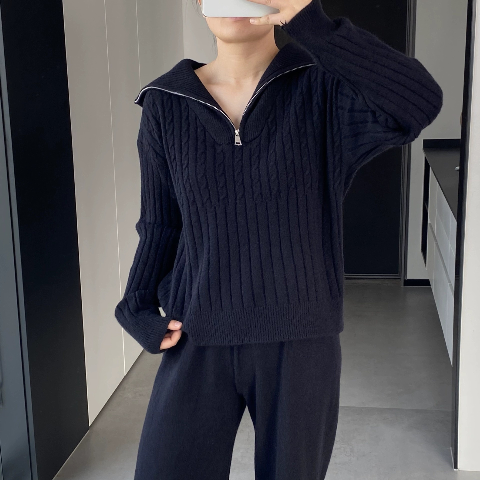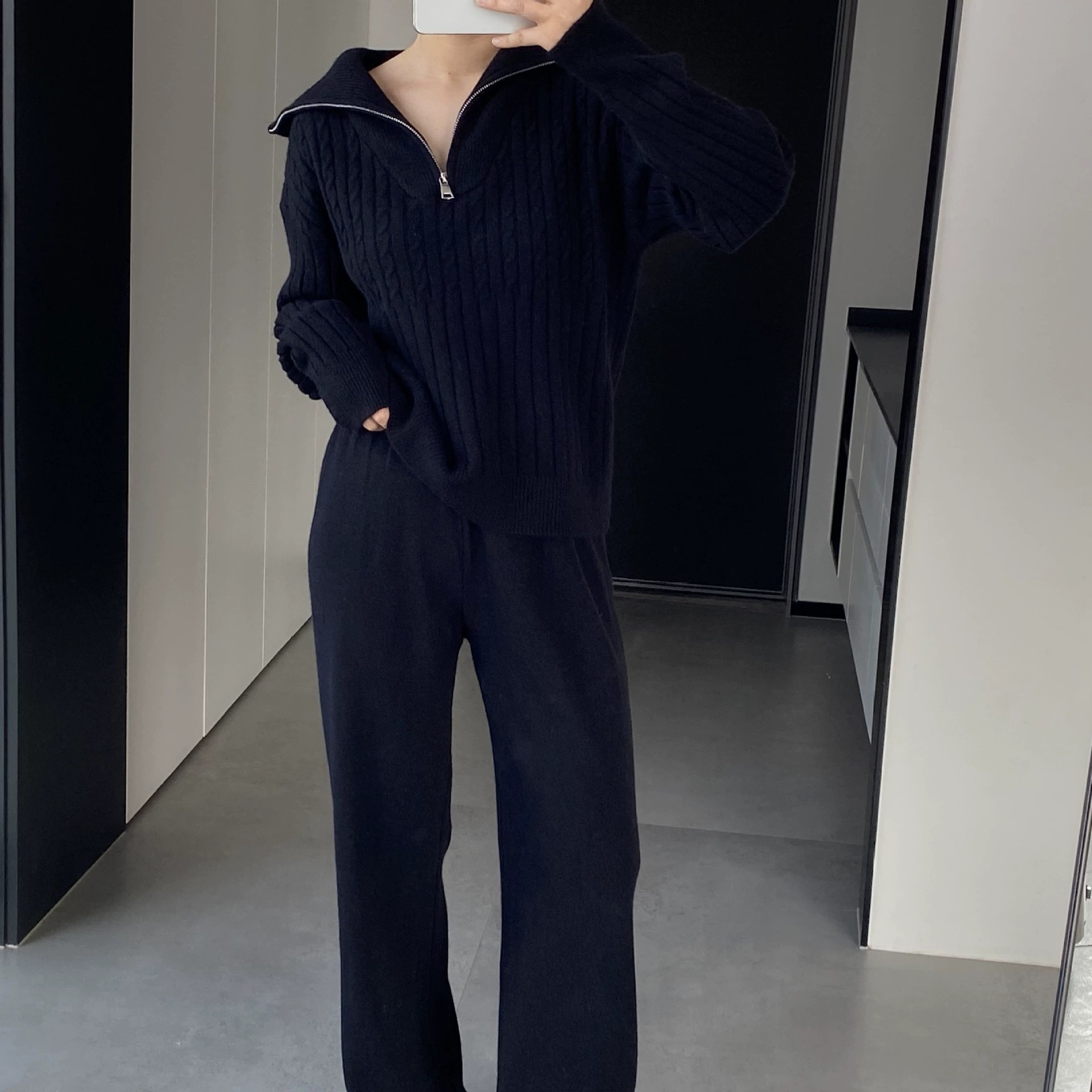 Turtleneck Zipper Lapel Pullover Long Sleeve Sweater Wide Leg Pants Two-piece Set