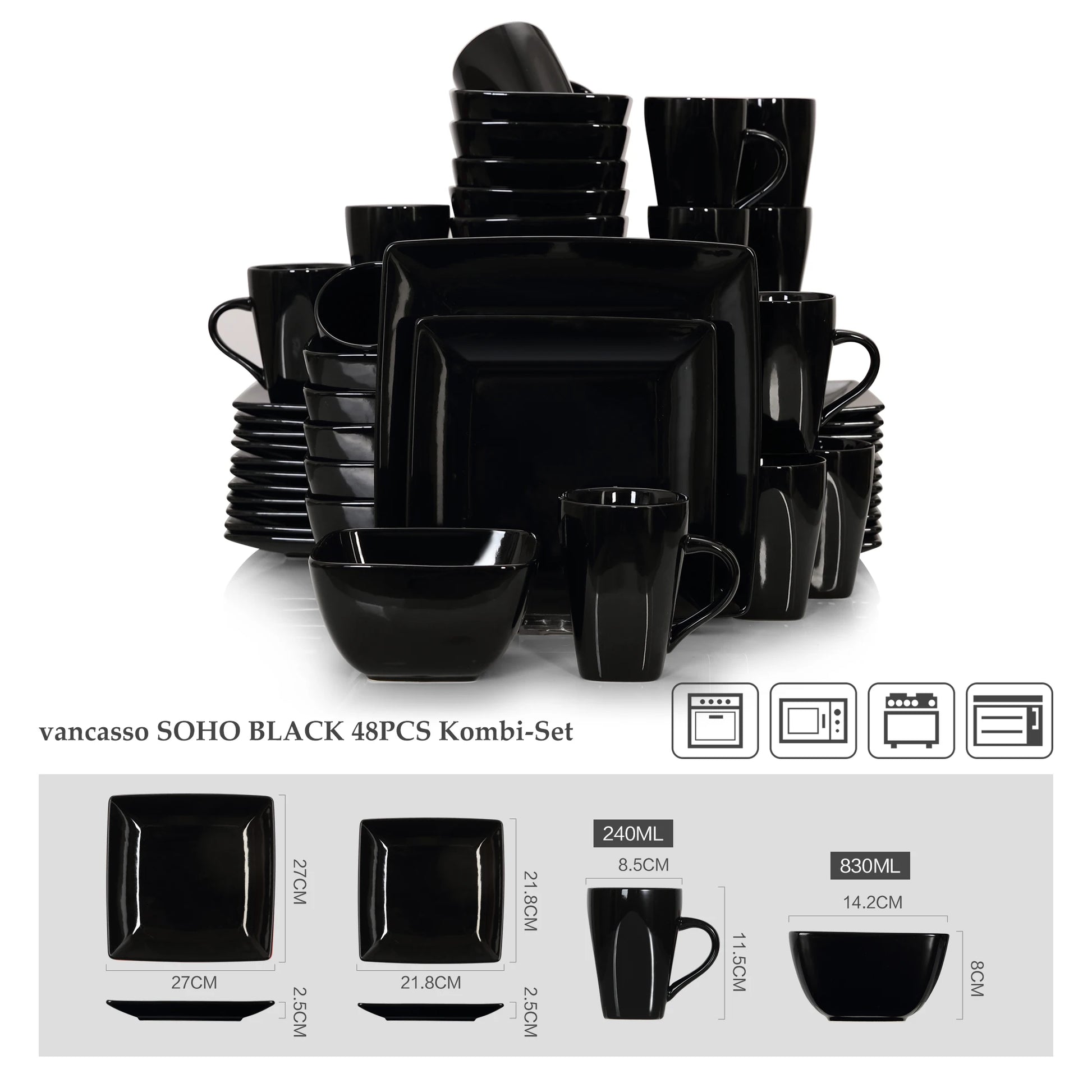 Vancasso SOHO 16/32/48-Piece Black Ceramic Porcelain Square Dinnerware Set with Dinner Plate,Dessert Plate,Bowl,240ml Mug Set