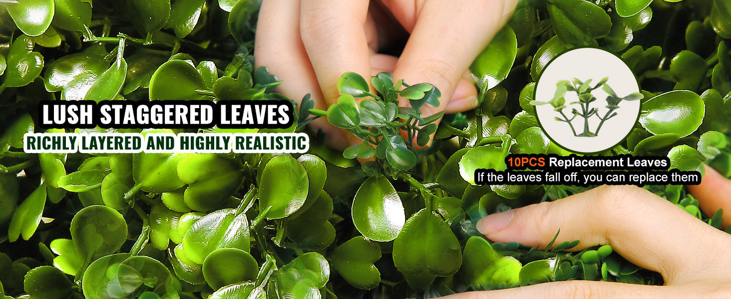 - Realistic and Lush: The staggered leaves for added visual appeal and realism and require minimal upkeep. They don't need watering, trimming, or fertilizing. The densely arranged leaves effectively conceals the inner framework of the topiary, ensuring a seamless and cohesive appearance.