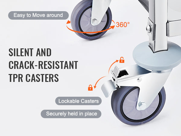 360° Silent Casters: Our stainless steel cart is equipped with four premium TPR swivel casters, allowing it to glide effortlessly and silently to any desired location, even when fully loaded. Additionally, two of the casters can be conveniently locked, providing enhanced stability and security, ensuring a secure position for your valuable items.