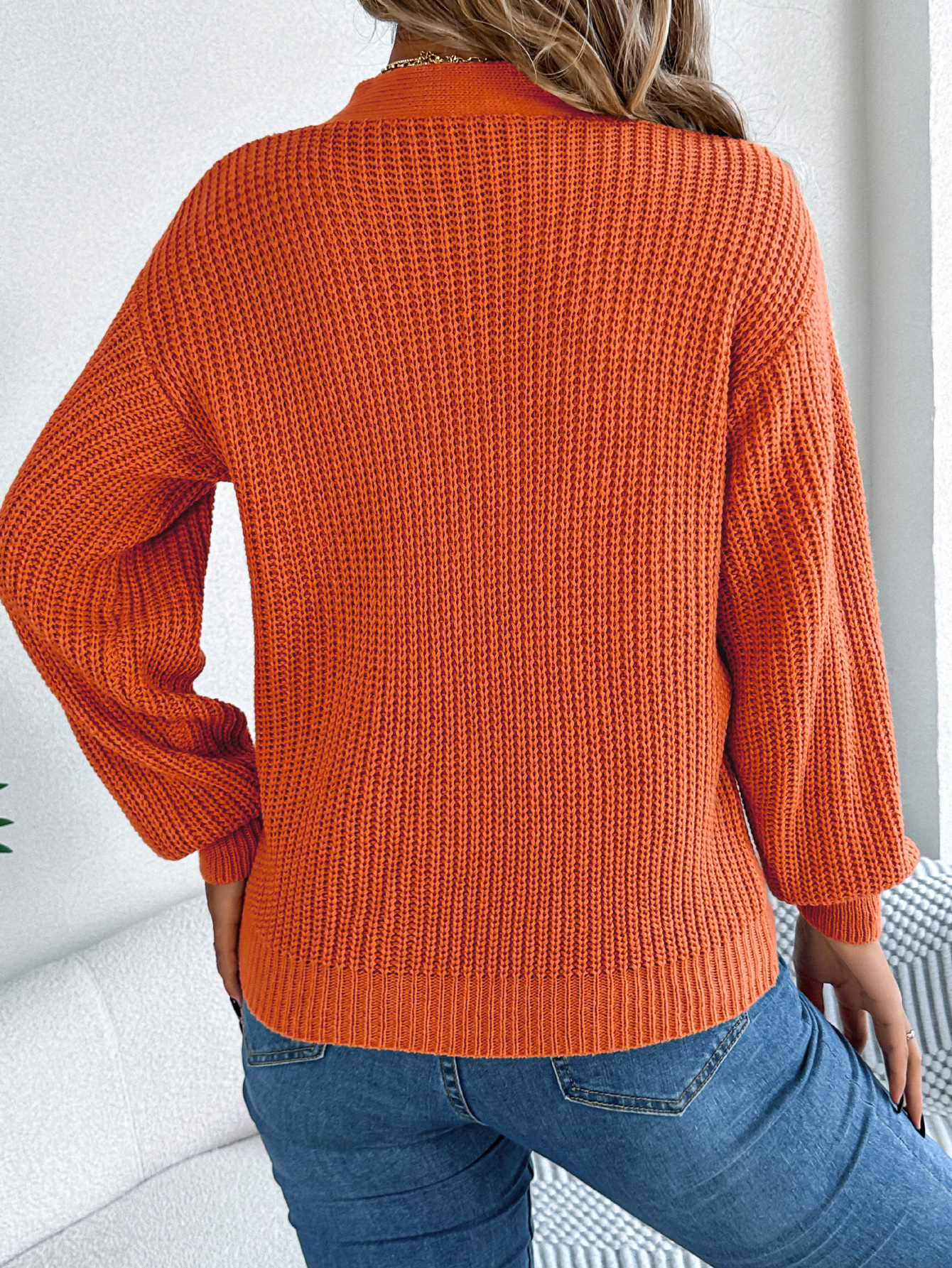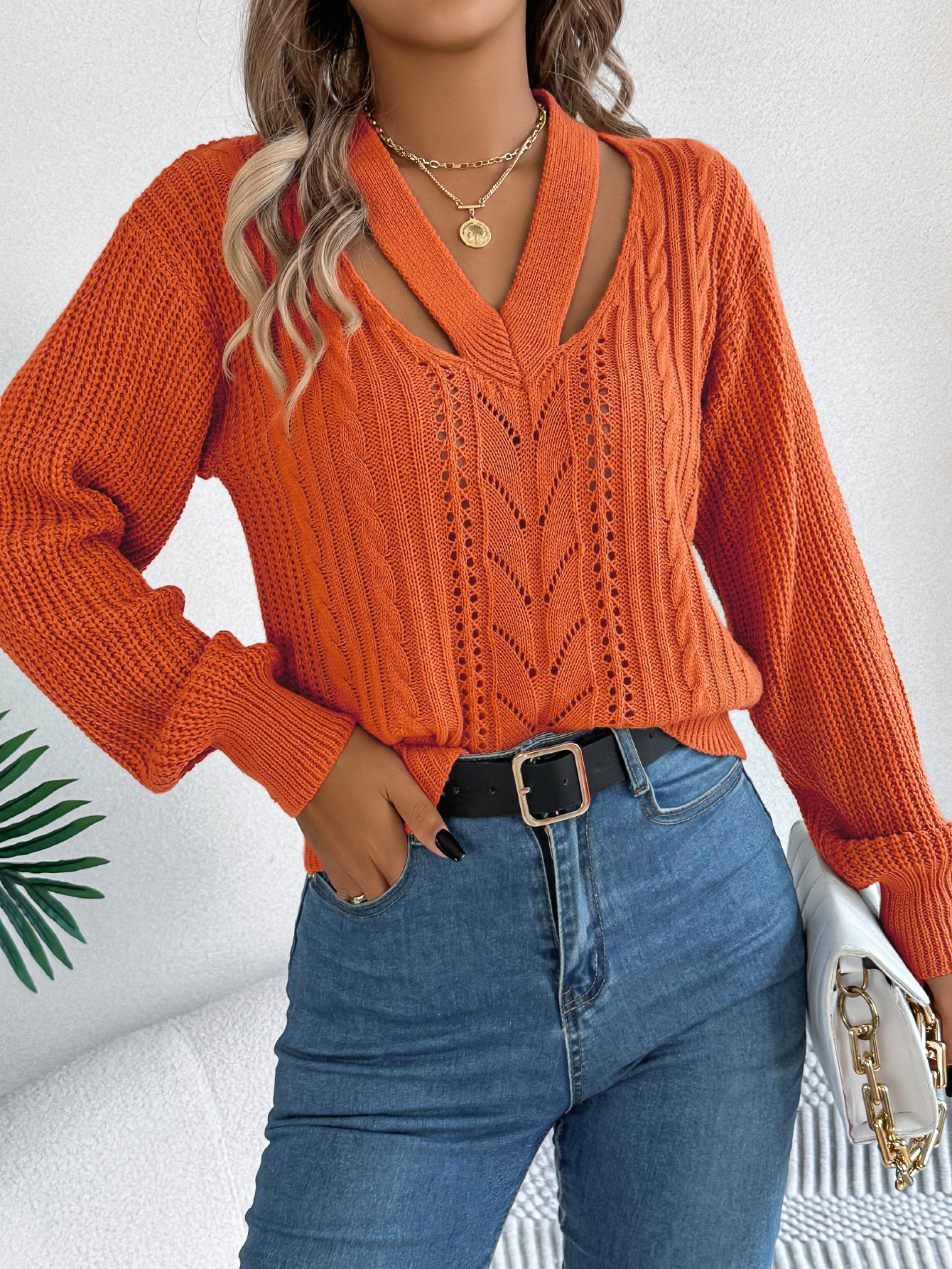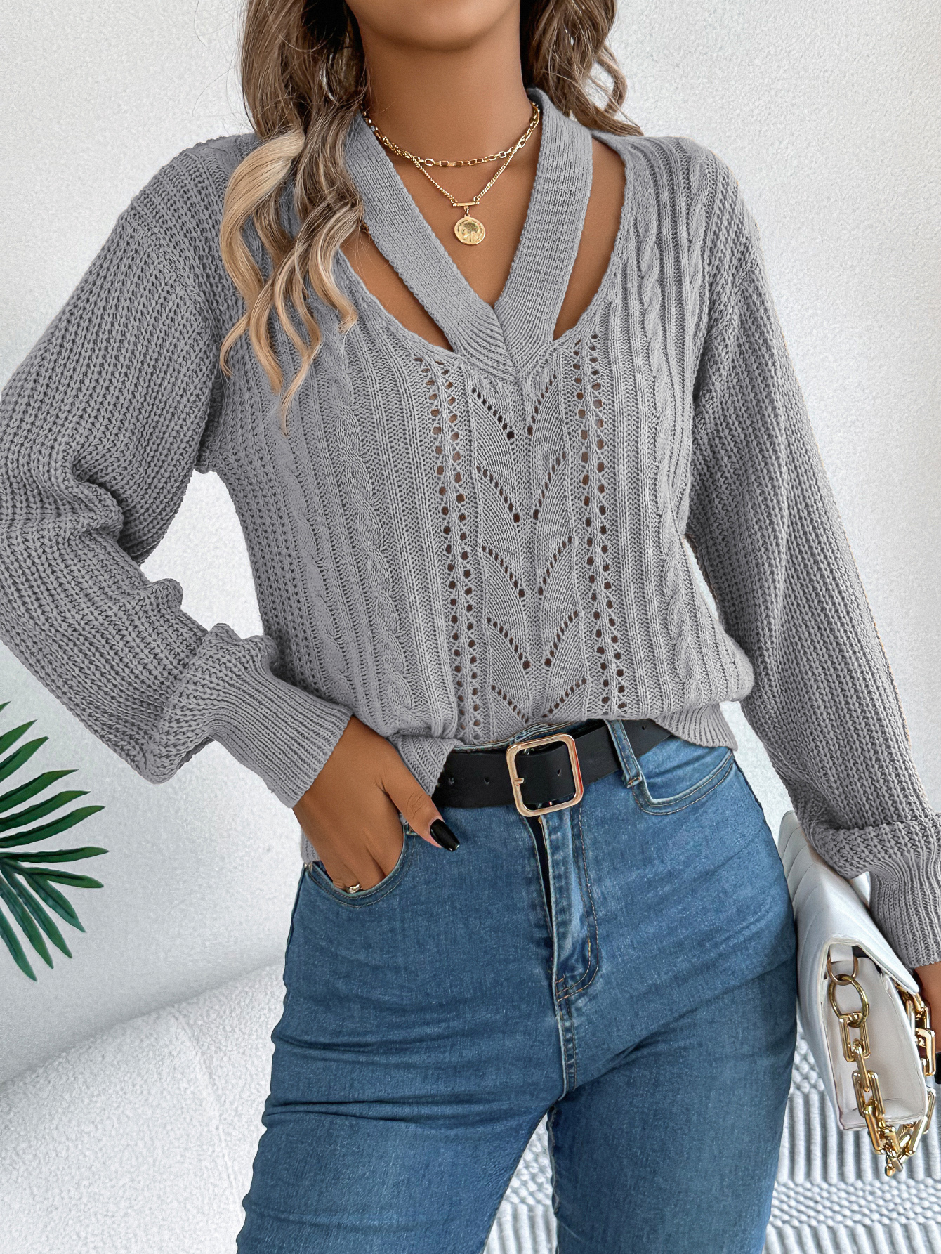 Women Casual Hollow Out V-Neck Cable Knit Lantern Sleeve Pullover Sweater