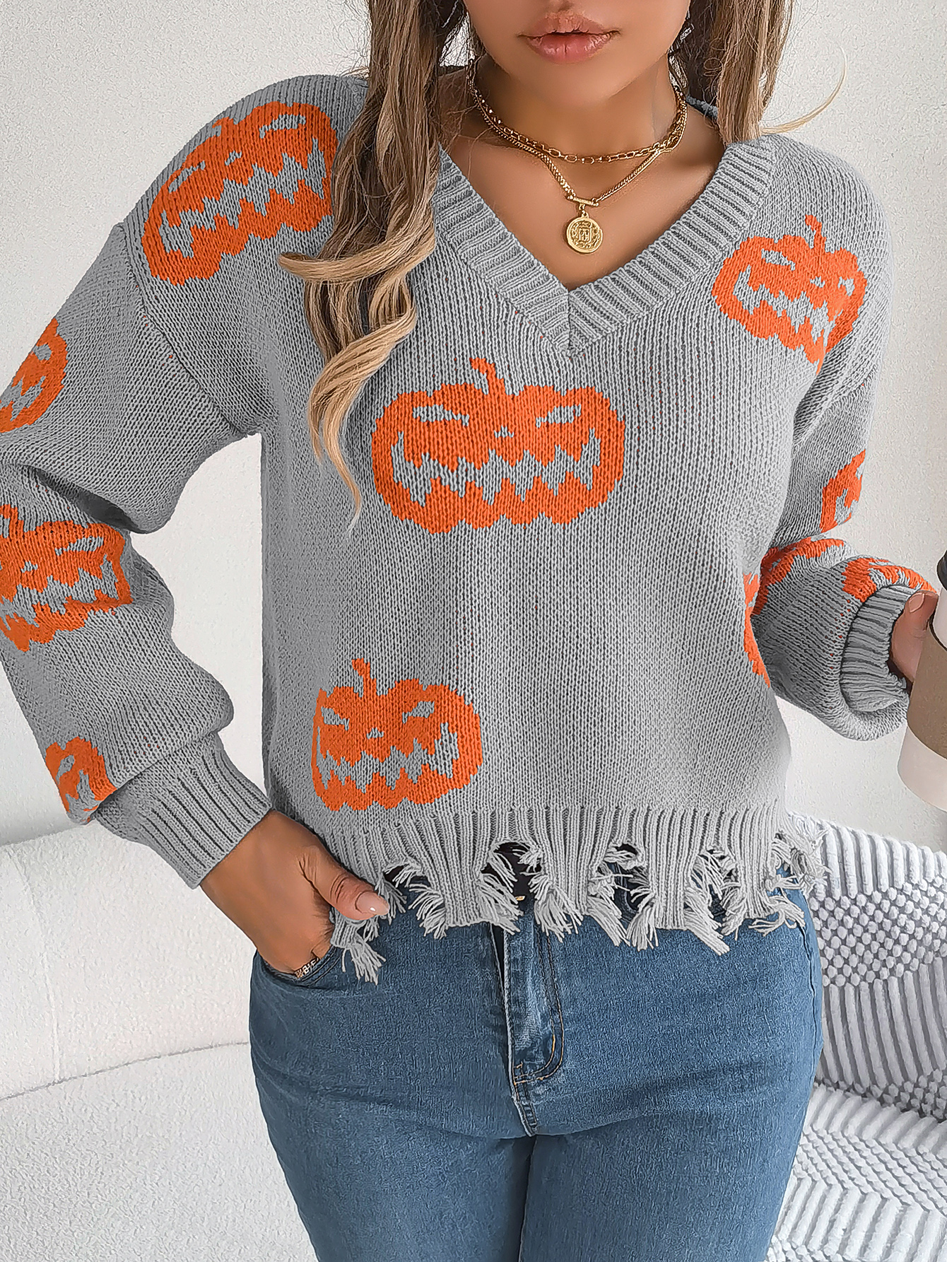 Women Color Block Pumpkin Distressed Long Sleeve Pullover Sweater