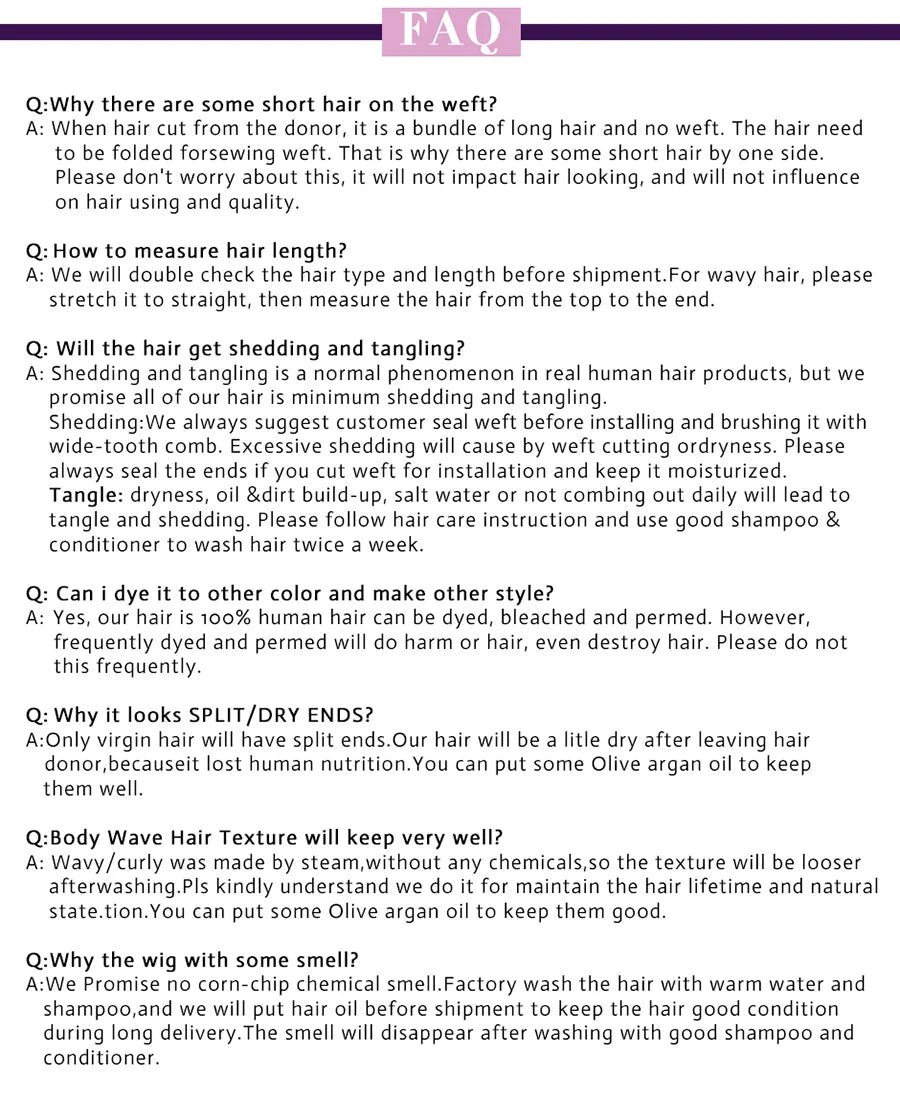 7.Hair quality:No tangles, no shedding, can be dyed, permed, curled, straightened, durable and silky.