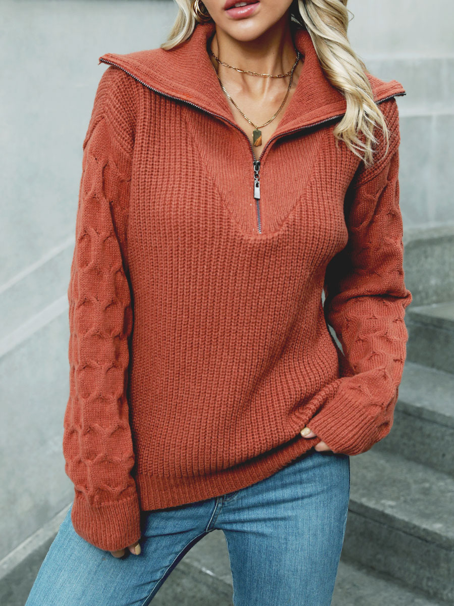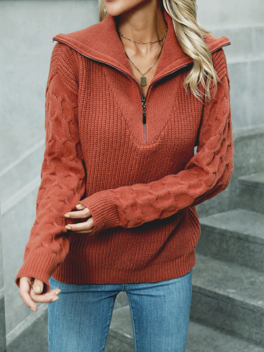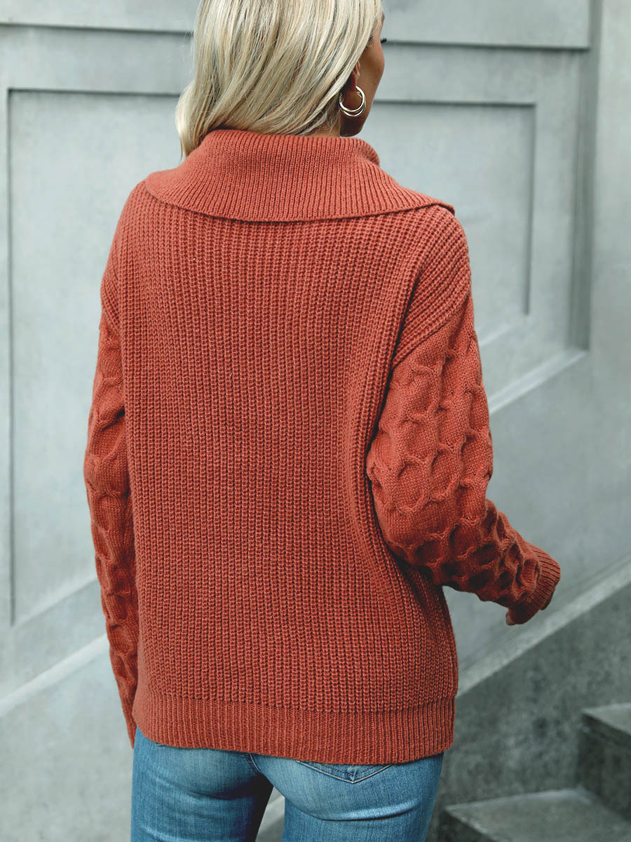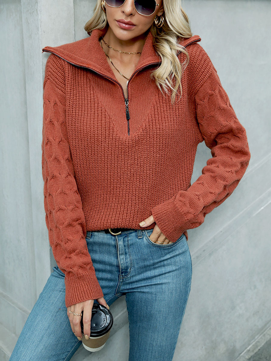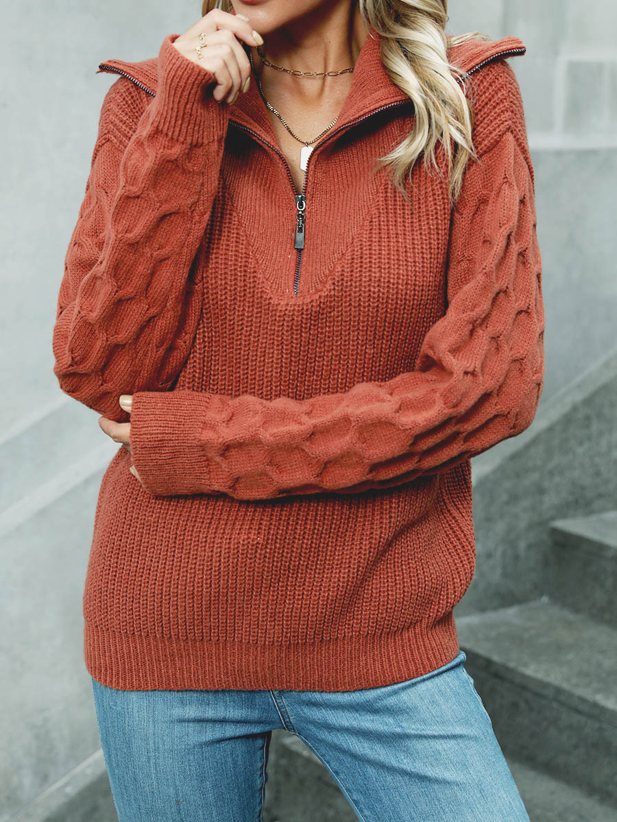 Customizable Zippered POLO Sweater With Large Lapel And Textured Knit Pullover
